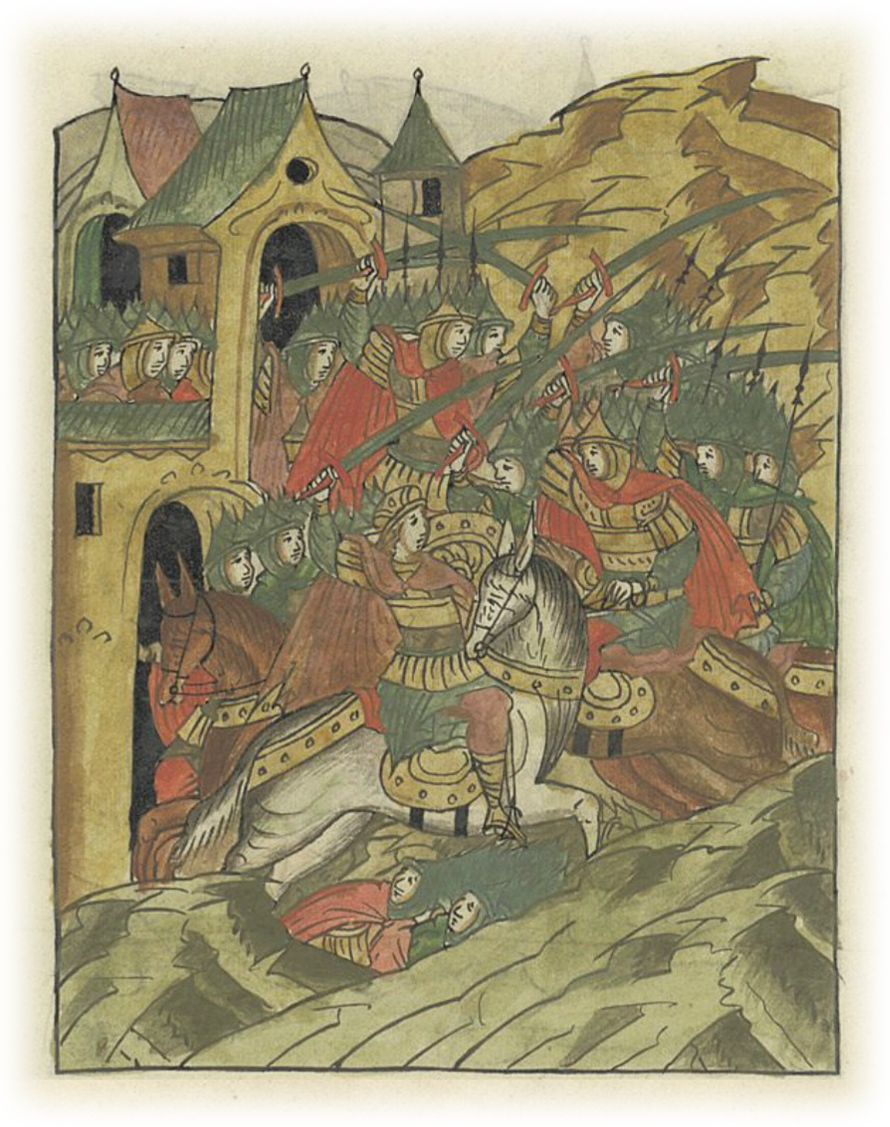 горожане же, увидев своих защитников изнемогающими, быстро выбежали из города, стали отважно биться с половцами,