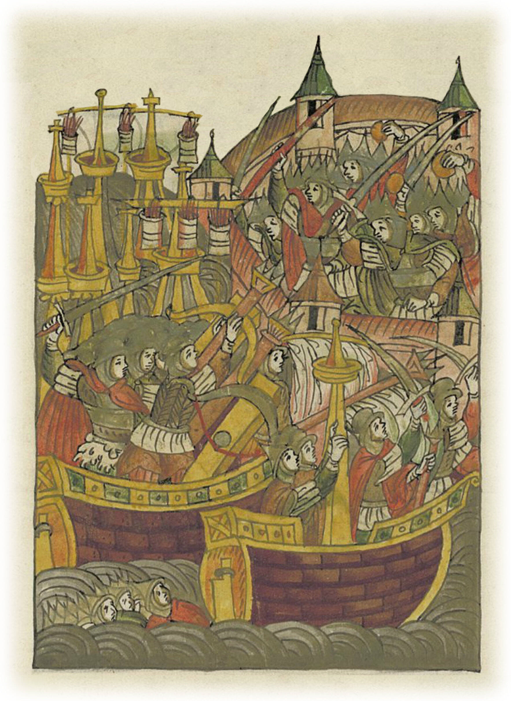 И приступили к городу месяца апреля в 9 день, но не успели еще ничего злого причинить городу, как убили около ста их воинов, и простояли латиняне под городом 3 дня.