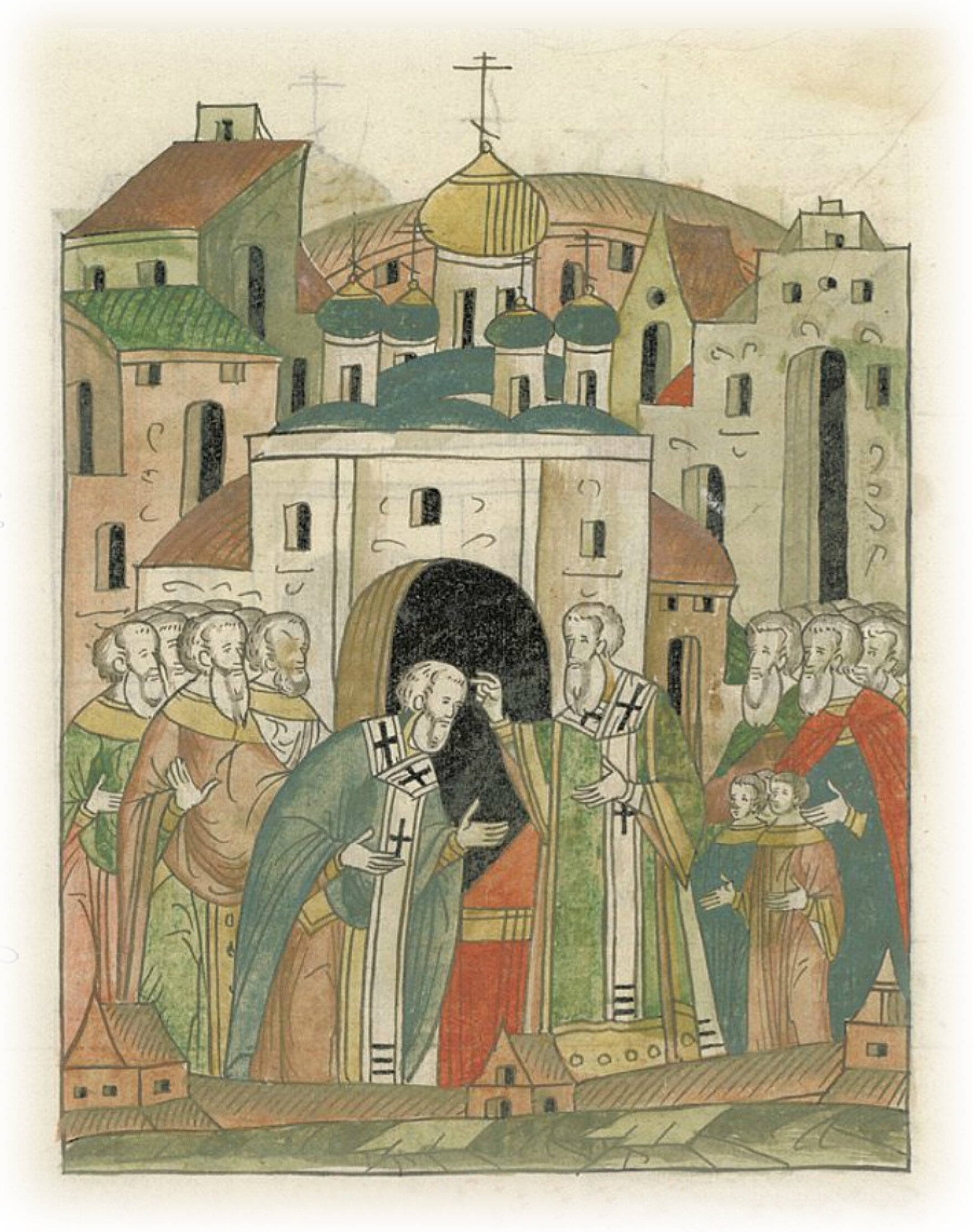 О поставлениии епископа в Тверь. Того же месяца августа в 24 день Симоном же, митрополитом всея Руси, поставлен епископом в Тверь Нил, игумен Богоявленский.