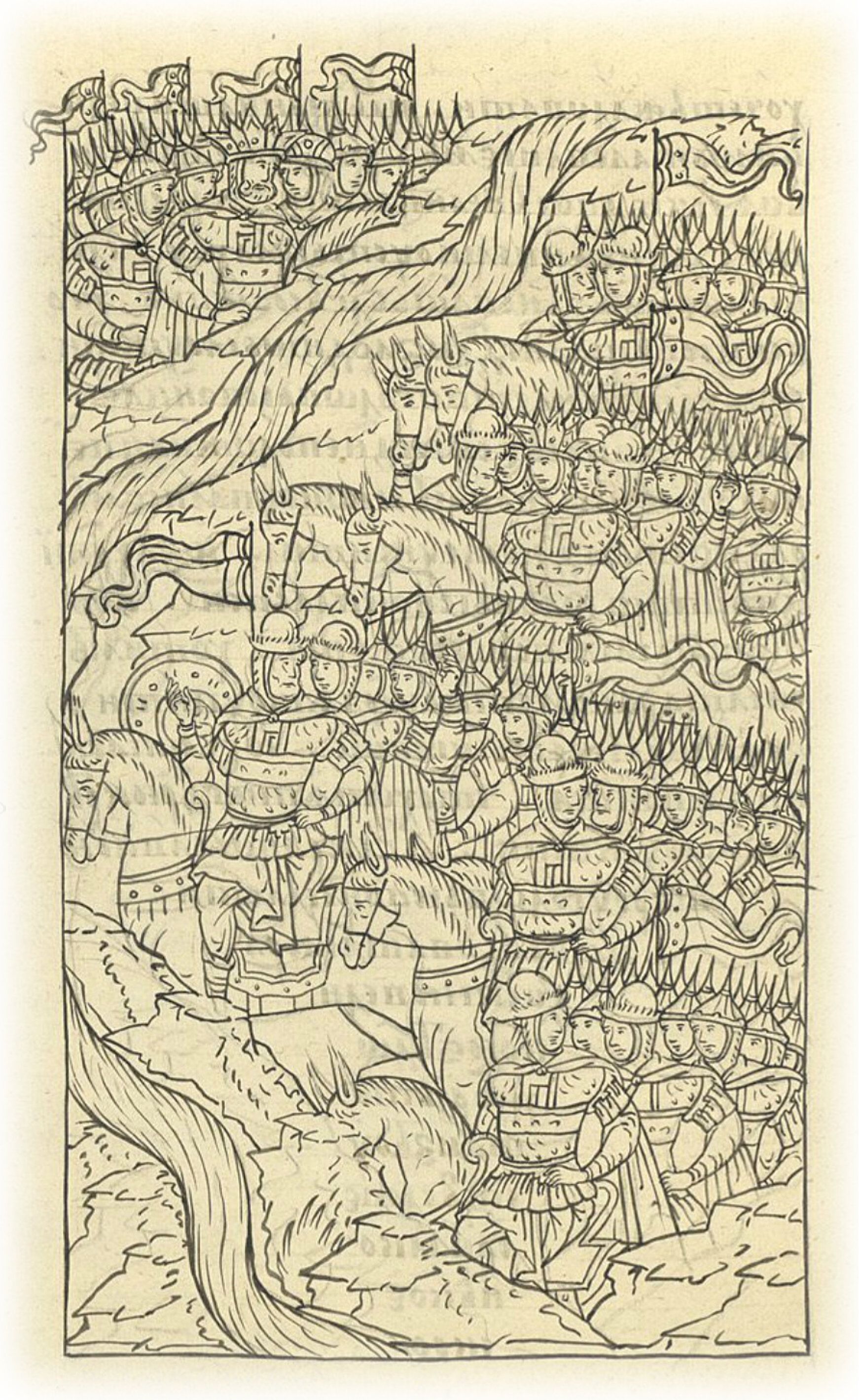 И пошли воеводы каждый со своим полком: в большом полку – бояре и воеводы, князь Дмитрий Федорович Бельский да князь Иван Михайлович Шуйский, да князь Михайло Иванович Кубенский; а с Пахры пришли царевич Шигалей да боярин и воевода Юрий Михайлович Булгаков; а велел князь великий царевичу Шигалею и князю Юрию Михайловичу быть в большом же полку; а в передовом полку – князь Иван Иванович Турунтай Пронский да князь Василий Федорович Охлябинин; а в полку правой руки – князь Иван Васильевич Шемяка Пронский да Семен Семенович Беззубцев; а в полку левой руки – князь Иван Михайлович Троекуров да князь Василий Семенович Мезецкий; а в сторожевом полку – князь Юрий Иванович Темкин Ростовский да князь Василий Васильевич Ушатый.