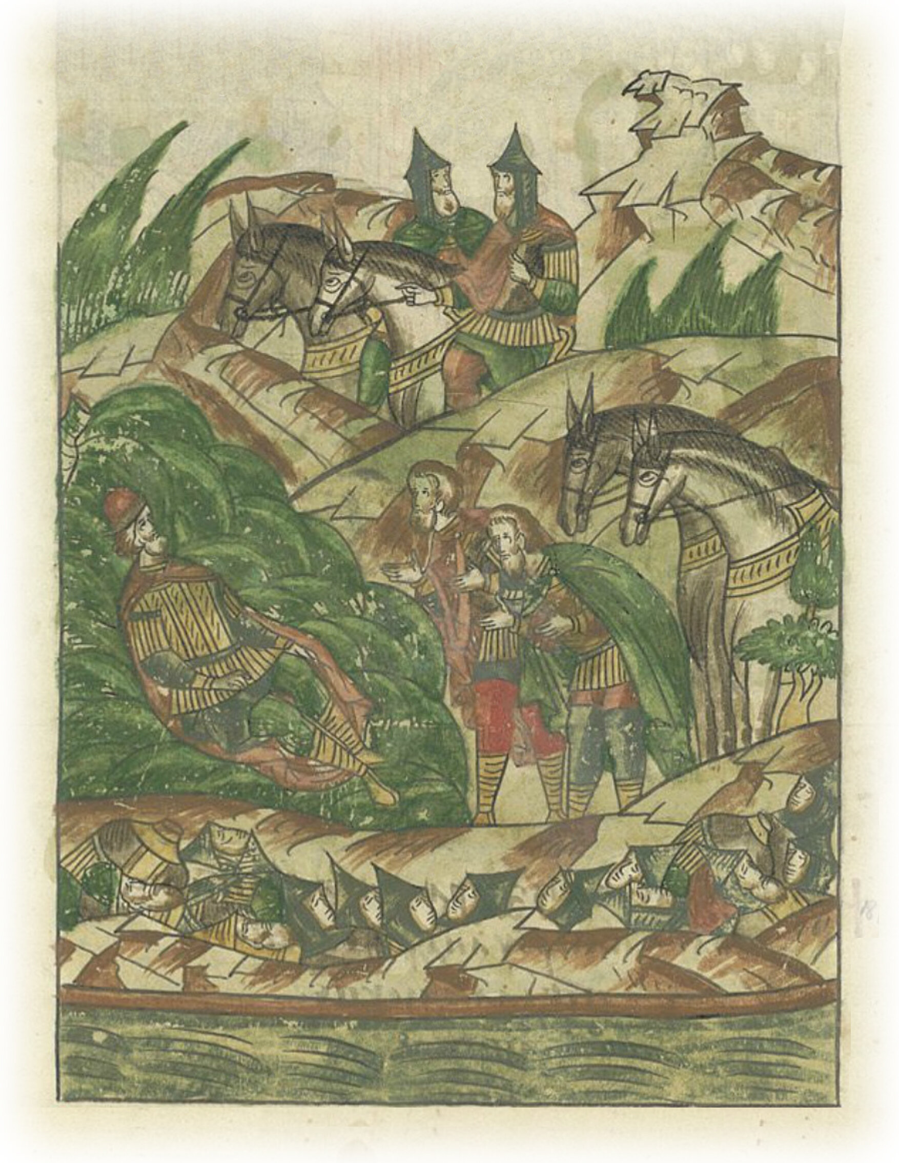 И наехали на великого князя, избитого сильно, едва дышащего, под новопосеченным деревом, под ветвями лежащего, словно мертвого. И соскочив с коней своих, поклонились ему.
