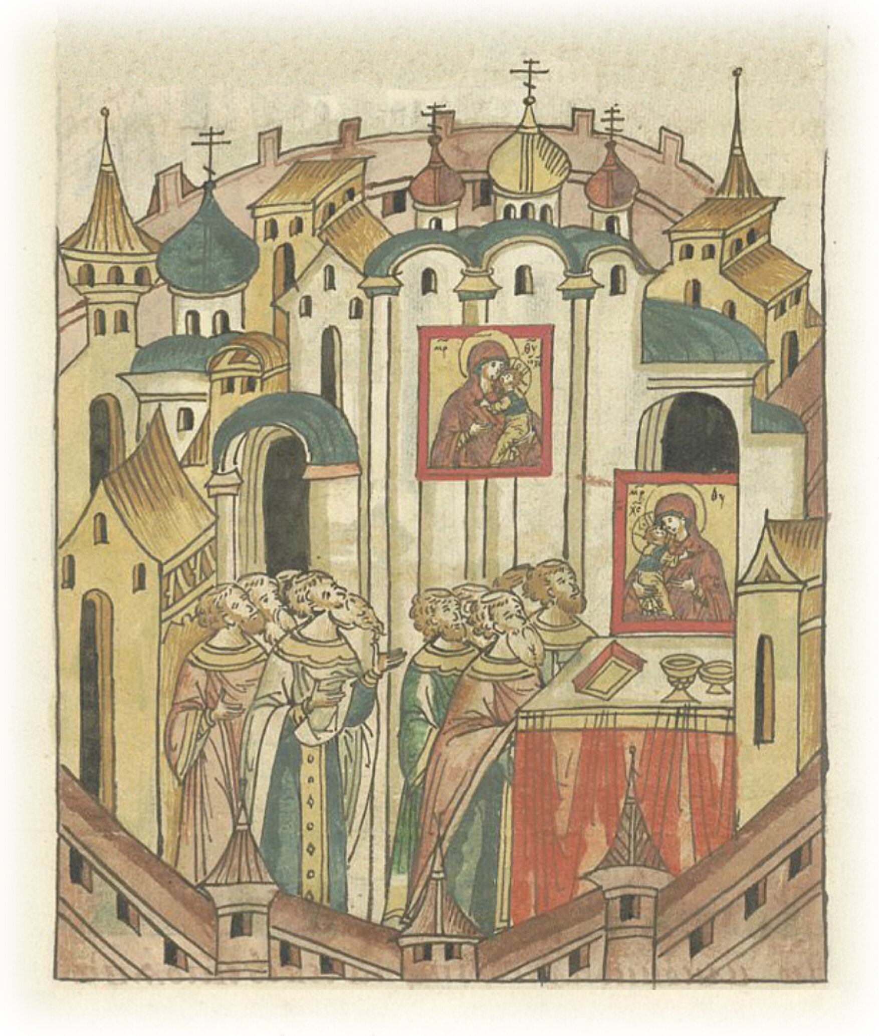 Чудо о том, как повернулась икона Богоматери лицом к алтарю. И в другой раз видели ту чудотворную икону, обратившуюся лицом к алтарю. И решили клирики, что икона Святой Богородицы хочет стоять в алтаре. Взяли ее священники, отнесли в алтарь и поставили за святой трапезной.
