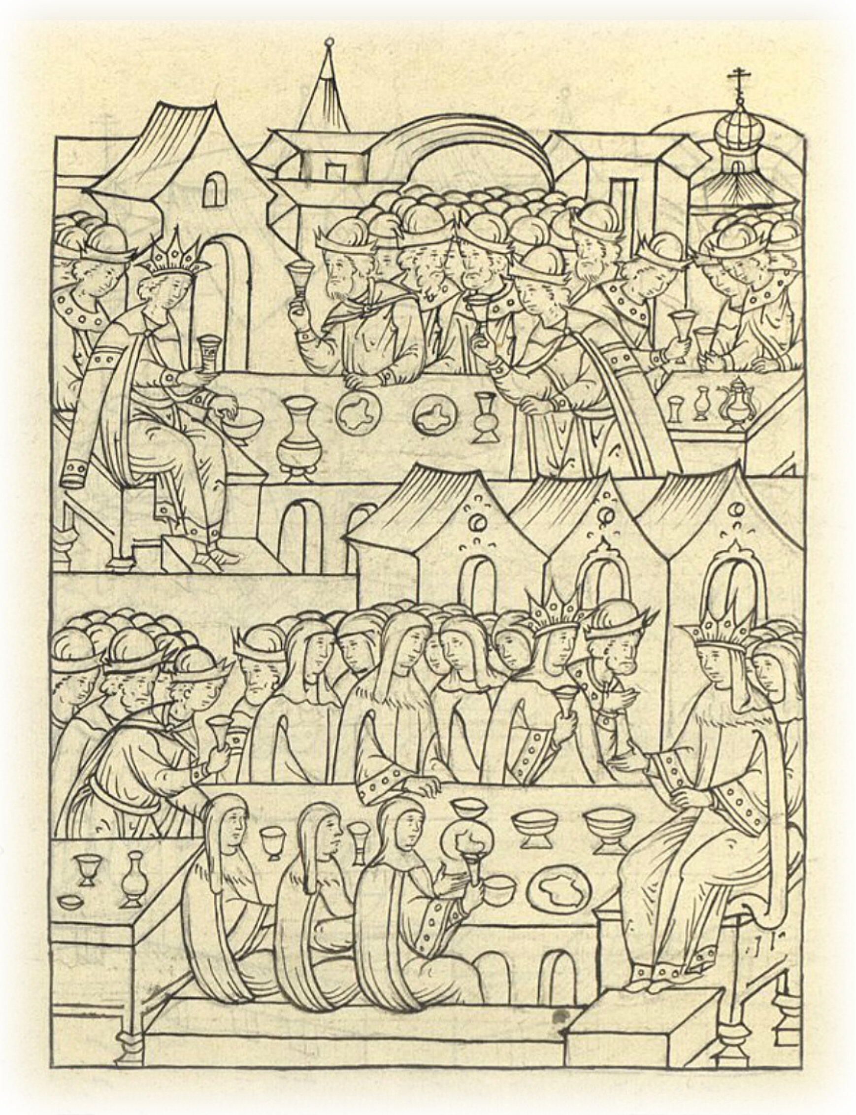 И ела в тот день Фатьма-Салтан царица у великой государыни в палате у Лазаря святого, а князь великий ел с боярами в избе у матери. А за столом у великой княгини сидела царица с правой руки в углу, а с левой стороны у великой княгини сидела на лавке князя Федора Михайловича Мстиславского княгиня Настасья, а под нею сидела Елена, жена Ивана Андреевича, да Агрипена, жена Василия Андреевича, и иные боярыни, а на скамье сидела князя Дмитрия Федоровича Бельского княгиня Марфа, да под нею Агрипина, жена Ивана Волынского, и иные боярыни, а другие боярыни на скамье сидели. А в кравчих был у великой государыни Иван Иванович Челяднин, а у царицы был кравчий князь Василий Репнин, а стольники и чашники все у великой княгини за столом были.
