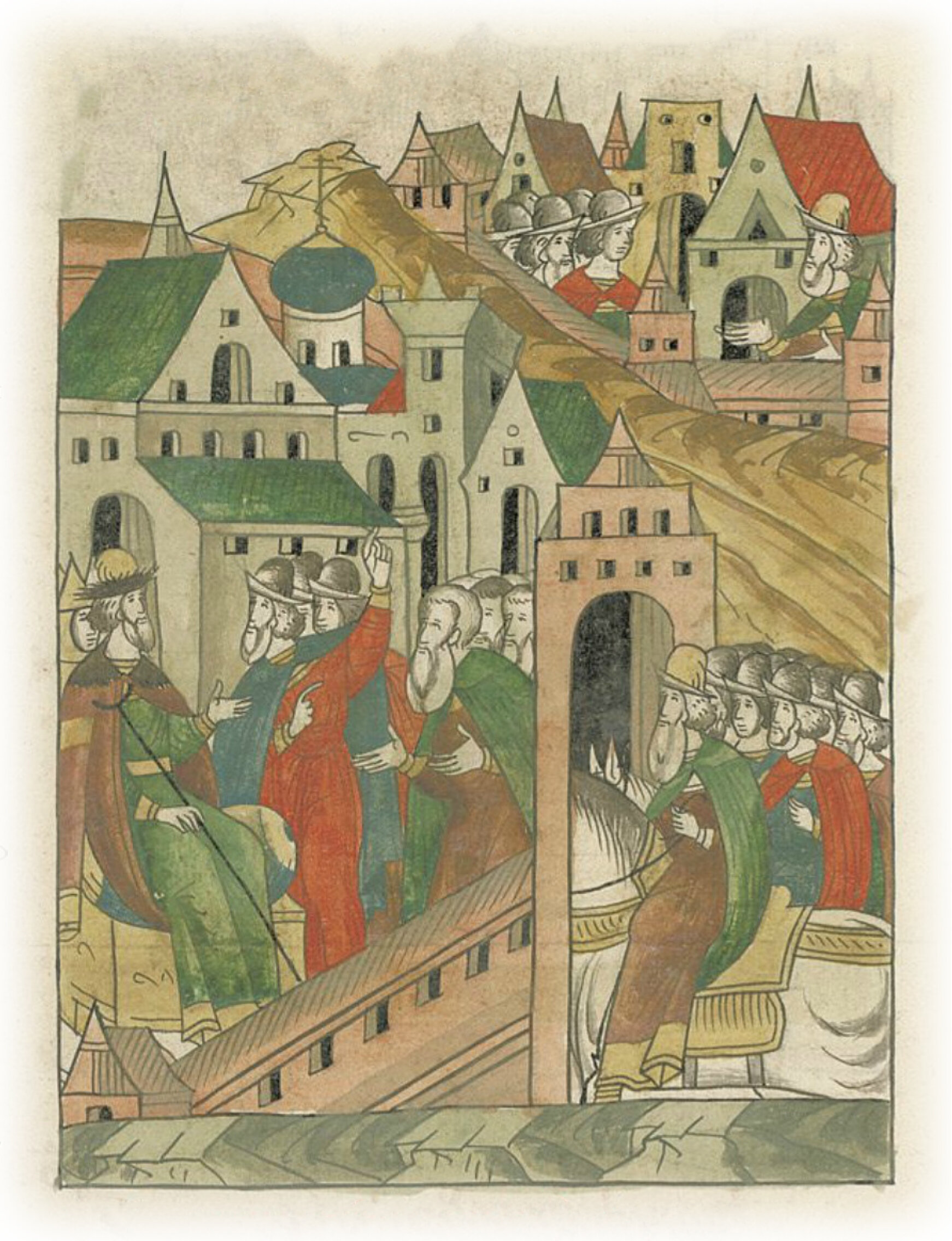 О Псковском взятии. И той же зимой приехали в Новгород к великому князю всея Руси Василию Ивановичу многие посадники псковские и купцы, и мужи от всего Пскова бить челом государю на его наместника, на князя Ивана Михайловича Оболенского Репню.