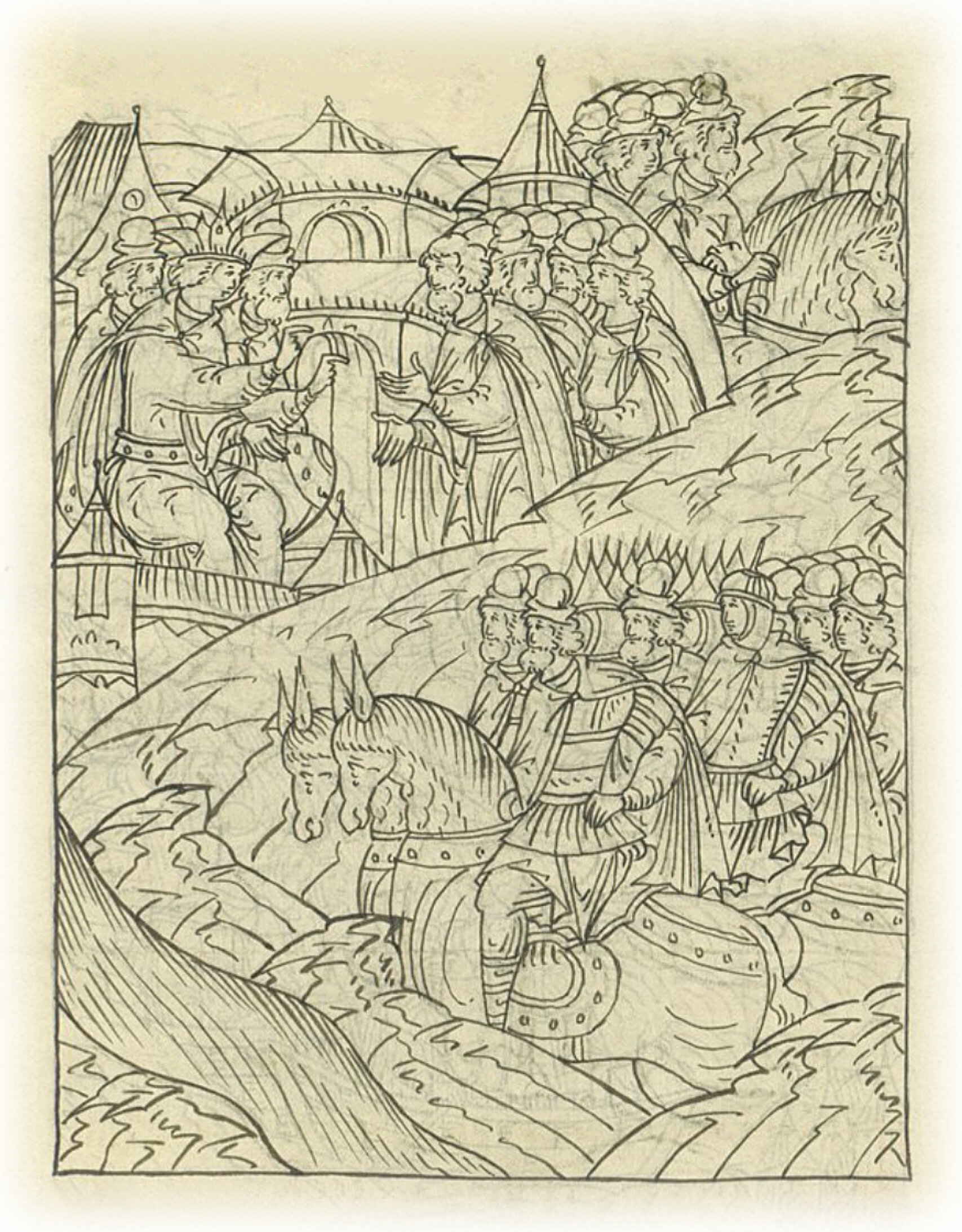 Языки говорят воеводам царя Ивана Васильевича, что магистр окопался большим рвом вокруг города Рындола, бьет из пушек и пищалей и приступает к Рындолу.
