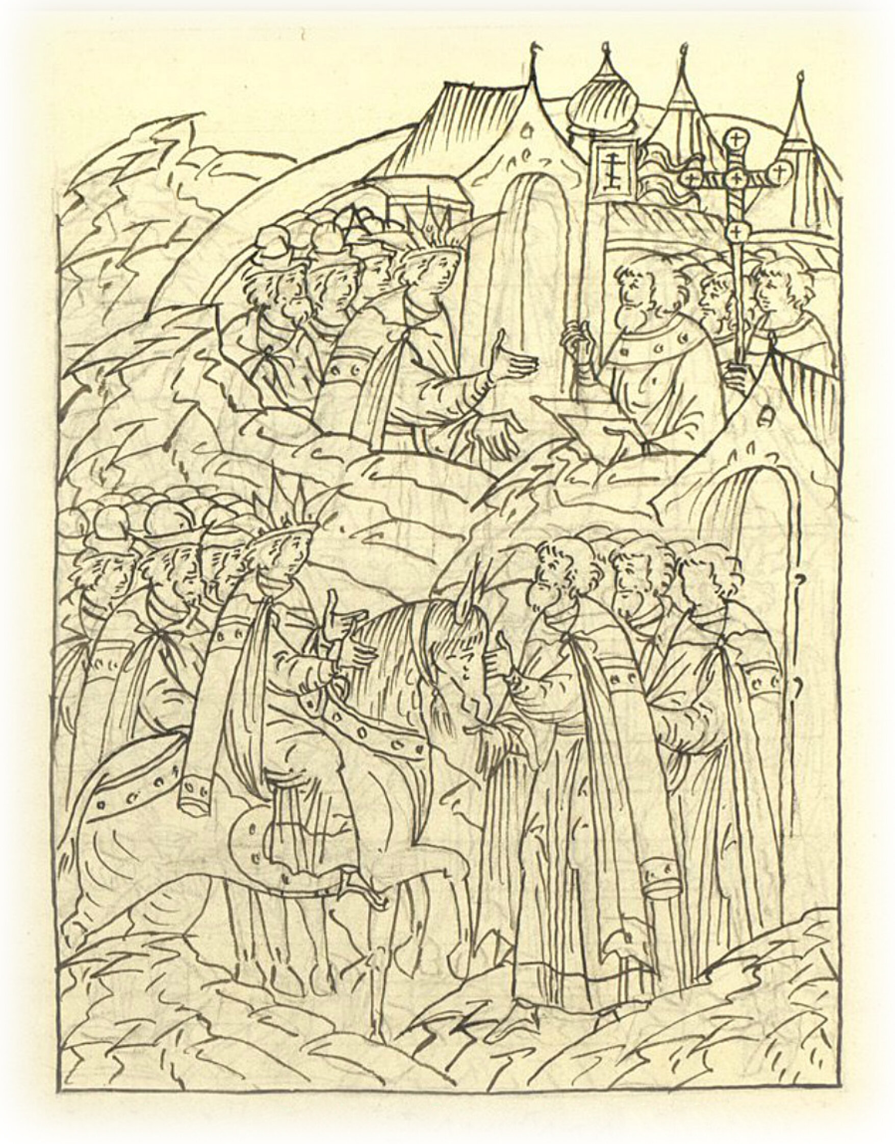 И пришел государь в Свияжский город 13 августа в субботу, встретили его государевы бояре, которые в городе были, князь Петр Иванович Шуйский да Семен Константинович Заболоцкой с товарищами, и дети боярские, и стрельцы, и все люди. Православные же христиане возрадовались радостью неизреченной, видя государя, пришедшего в здравии из долгого пути, и встречают государя в городских воротах с крестами.
