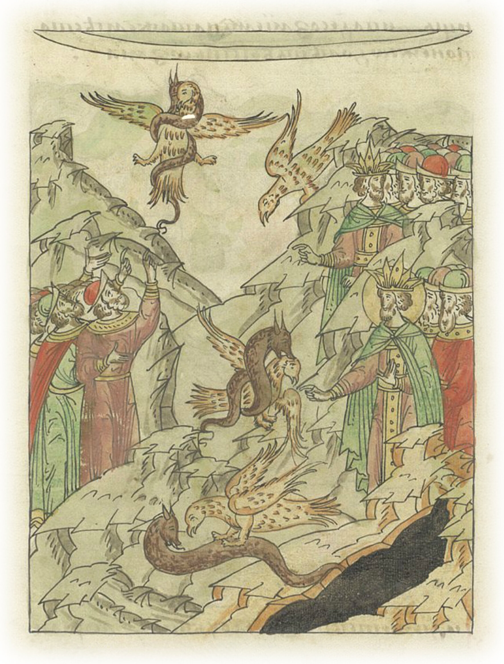 И тут внезапно выполз из норы змей, и пополз, но сверху на него упал орел, змея подхватил и полетел в высоту; змей же начал обвиваться вокруг орла. Царь же и все люди смотрели на орла и на змея. Орел же скрылся из глаз на долгое время и потом появился летящим вниз, и упал со змеем на то же самое место, так как побежден был змеем.