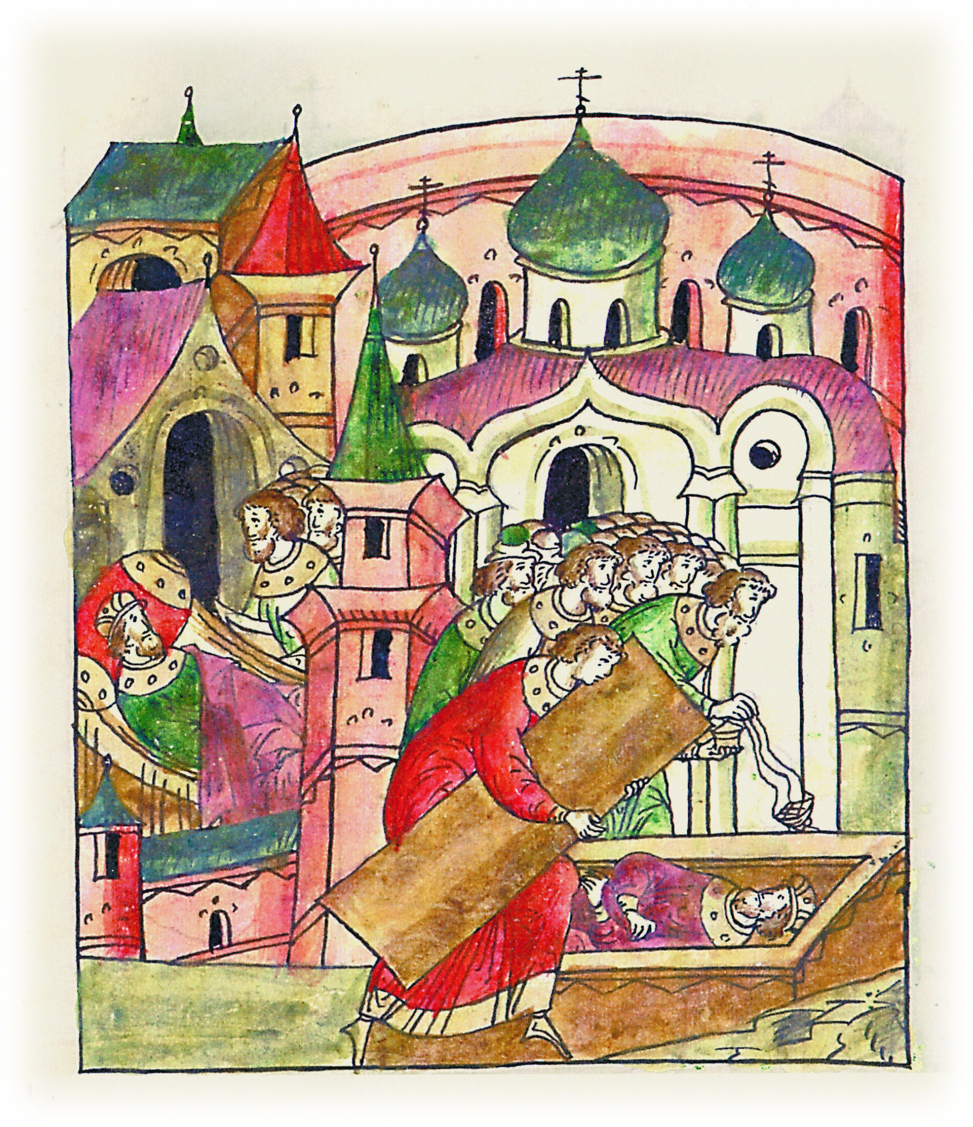 Кончина князя Изяслава Андреевича и его похороны в церкви пречистой Богородицы во Владимире.