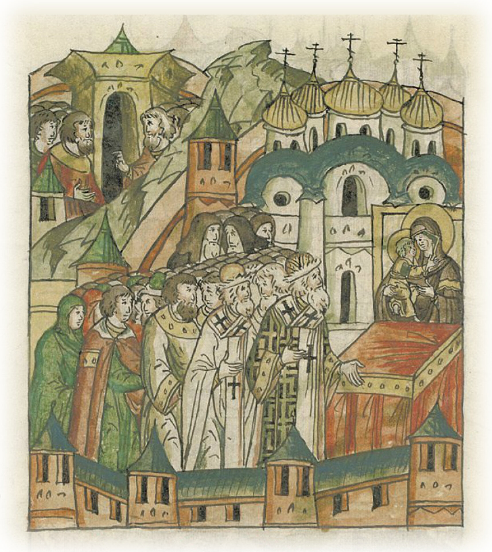 Всенародная молитва к Богу. Тогда же преосвященный Варлаам, митрополит всея Руси, и прочие святители, и весь освященный собор, и иноческий чин, и множество всенародного достояния от вельмож и до простых людей всякого возраста, мужского пола и женского, и не только на Москве, но и по всей Русской земле, все молились, каждый о своих согрешениях, и все скорбили и каялись,