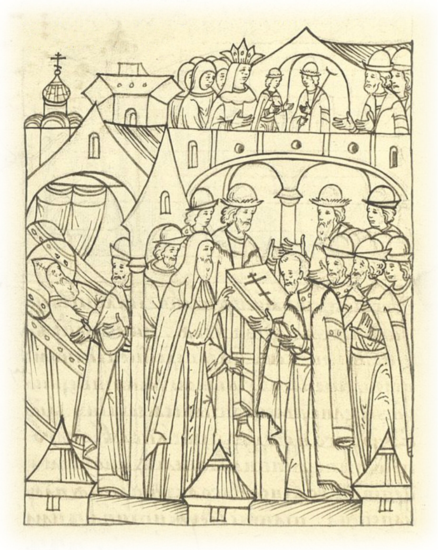 И бояр и боярских детей, и княжат, и дворян по тому же приводили к крестному целованию, чтобы им желать добра великому князю Ивану Васильевичу всея Руси и его матери великой княгине Елене, и всей земле хотеть им добра во всем вправду, и от недругов великого князя и всей земли, от латинства и от басурманства, стоять вместе заодно, а иного государя помимо великого князя Ивана Васильевича не искать.