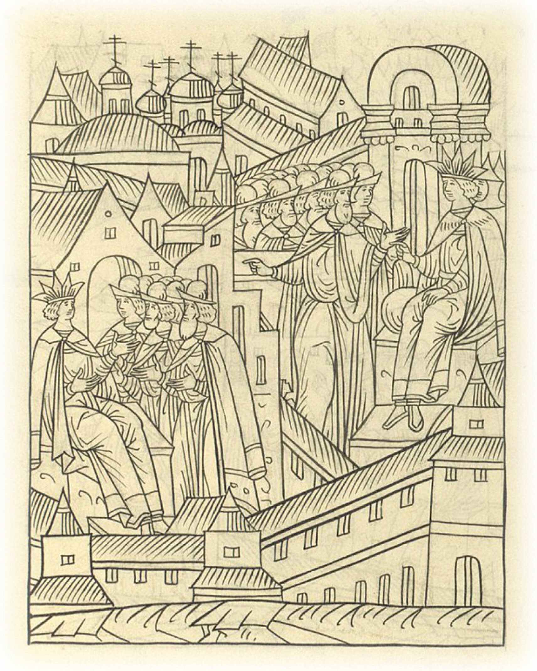 Ругодивские посадники Яким и Захар приезжают в Москву. Воеводы царя Ивана Васильевича Алексей Адашев и Иван Михайлов сообщают им, что государь пожалует их, если сдадут его воеводам помимо Ругодива Вышгород.