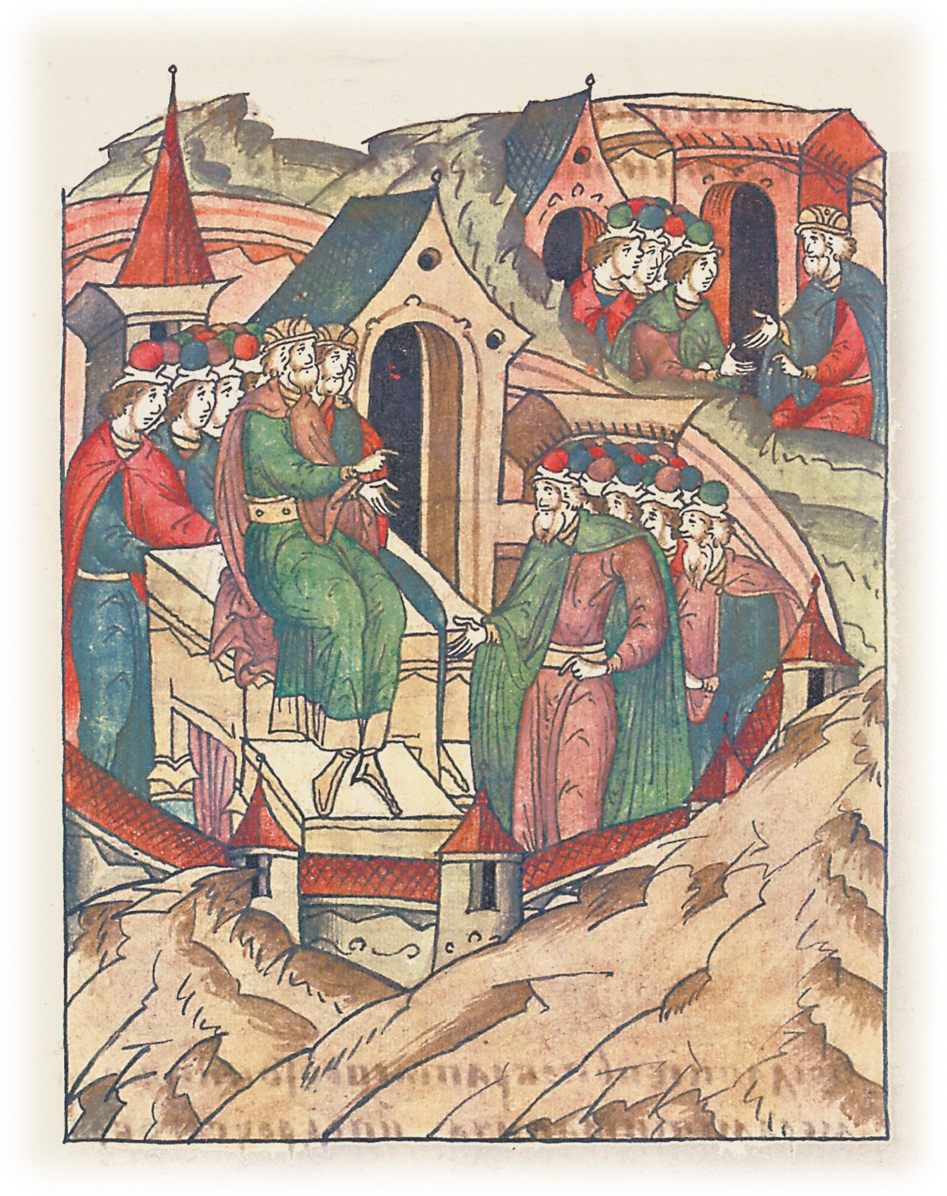 Ругодивские посадники Яким и Захар приезжают в Москву. Воеводы царя Ивана Васильевича Алексей Адашев и Иван Михайлов сообщают им, что государь пожалует их, если сдадут его воеводам помимо Ругодива Вышгород.