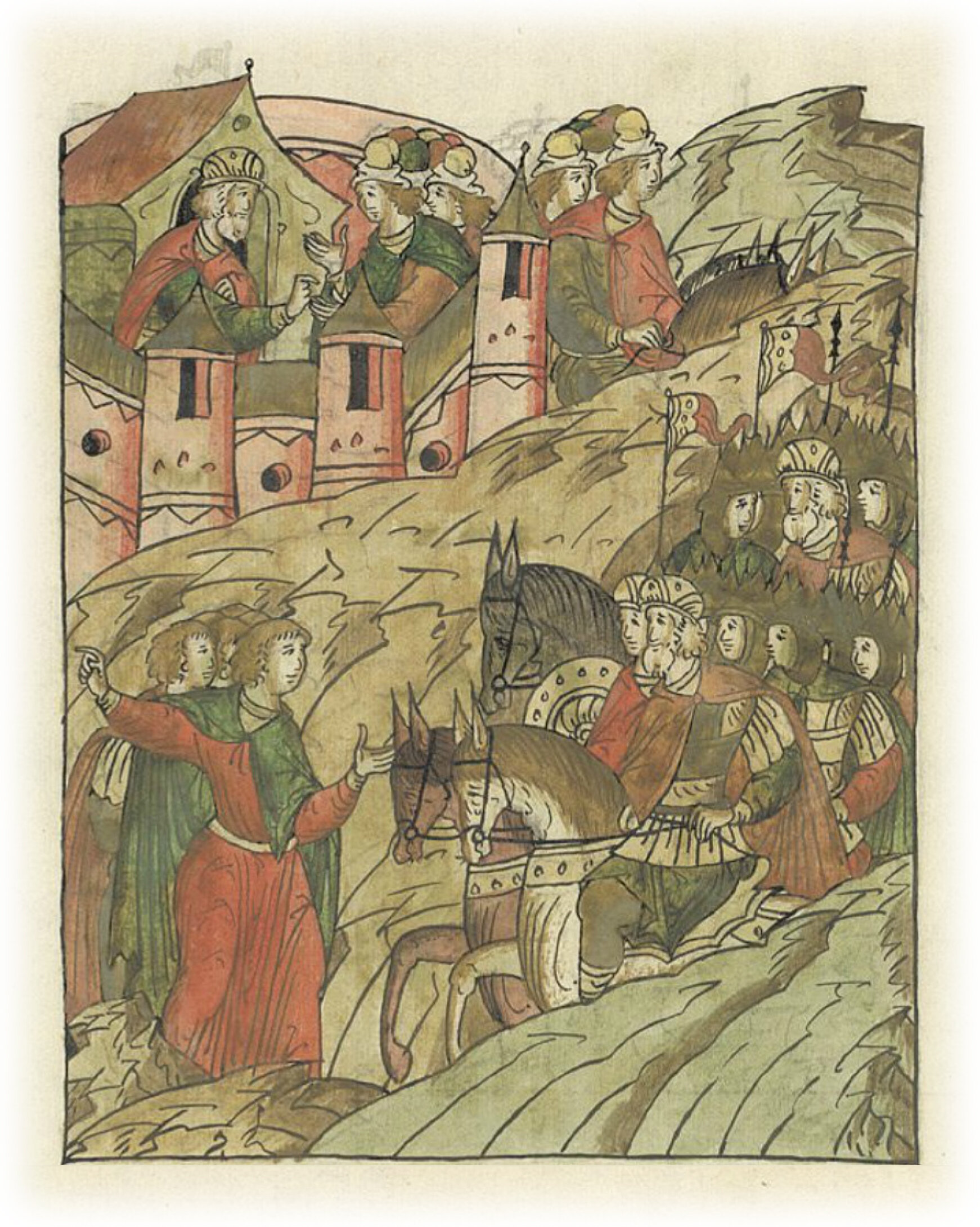 Князь же Юрий выслал из города к князьям с челобитьем: «Потерпите меня сегодня, а завтра уйду из города, только не выдайте меня брату моему Константину».