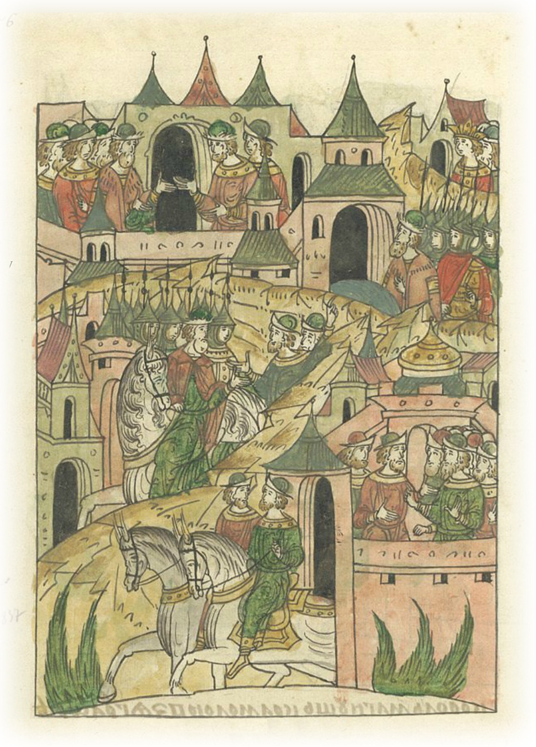 И послали новгородцы к великому князю Семену Ивановичу просьбу, чтобы он пришел к ним на помощь. Великий князь дошел до Торжка и возвратился, потому что его догнали киличеи* из Орды, возвестив ему слово царское о даре: выдал царь ему тогда Ольгердова брата Кариада. И тогда он сам возвратился в город Москву, * послы.