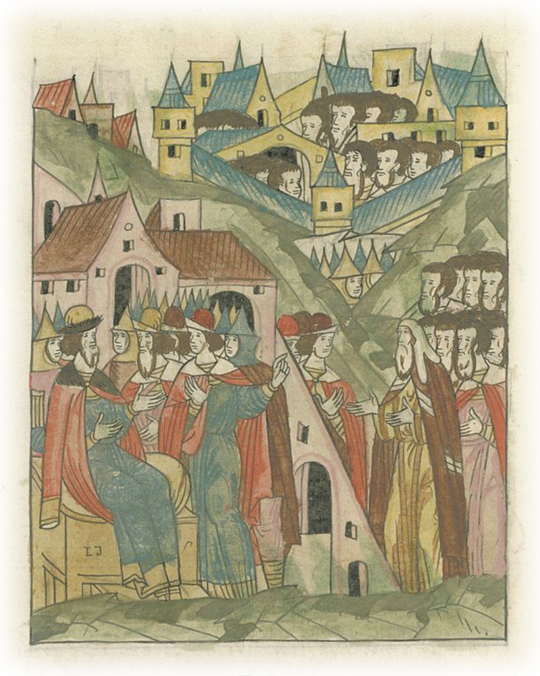 В том же месяце декабре в 7 день пришел к великому князю владыка из Новгорода с теми же прежденазванными посадниками и зажиточными мужами, да с ними 5 человек черных людей от пяти концов: от Неревского конца – Аврам Ладожанин, а от Горнческого – Кривой, а от Словенского – Захар Брех, а от Загородского – Харитон, а от Плотнического – Федор Лытка.