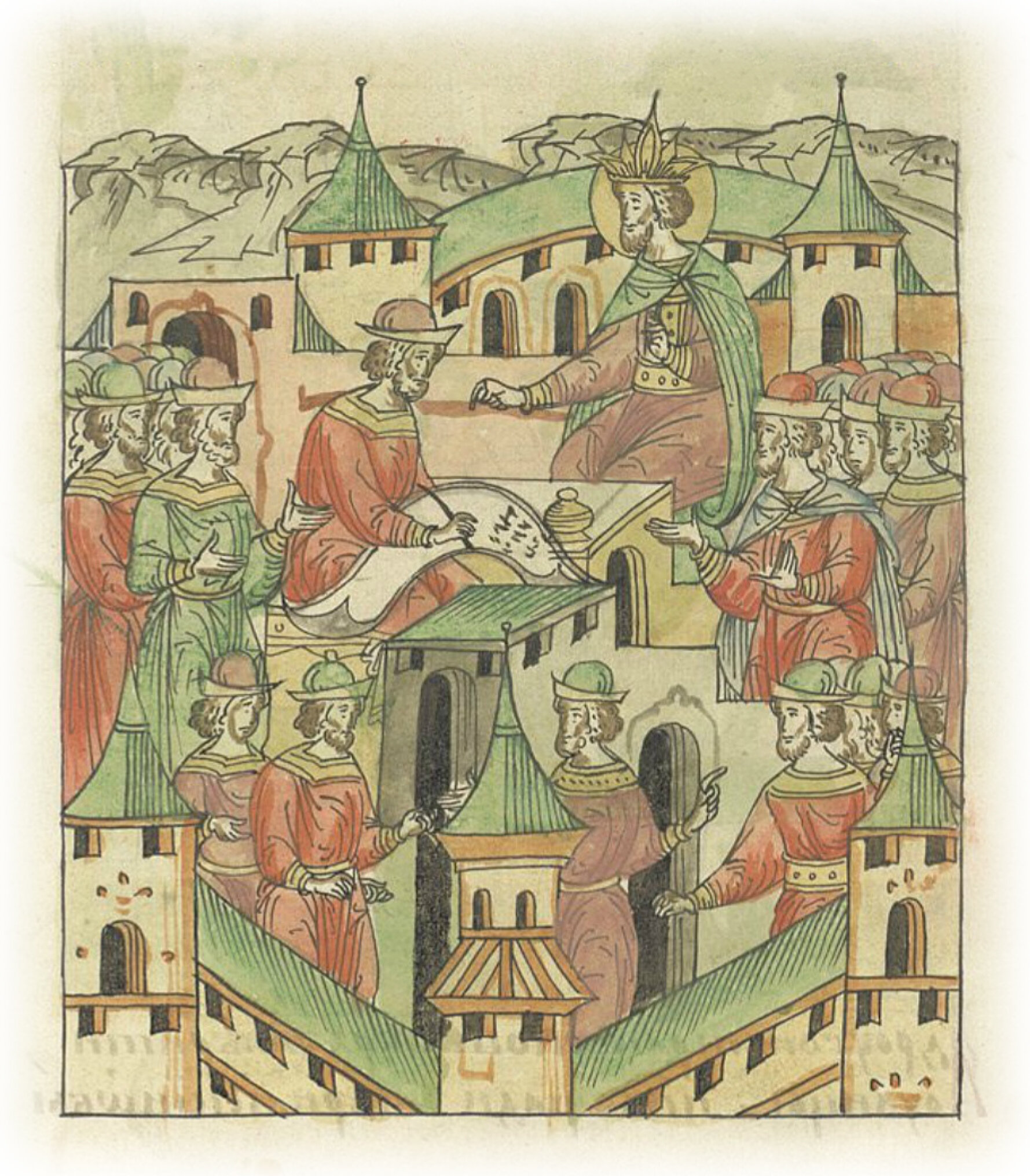 Великий же Константин весьма возмутился этому, но, однако, словеса их повелел записать. А магистров и городских мастеров разделил надвое и одним повелел размерить городские стены и стрельницы и начать их строить;
