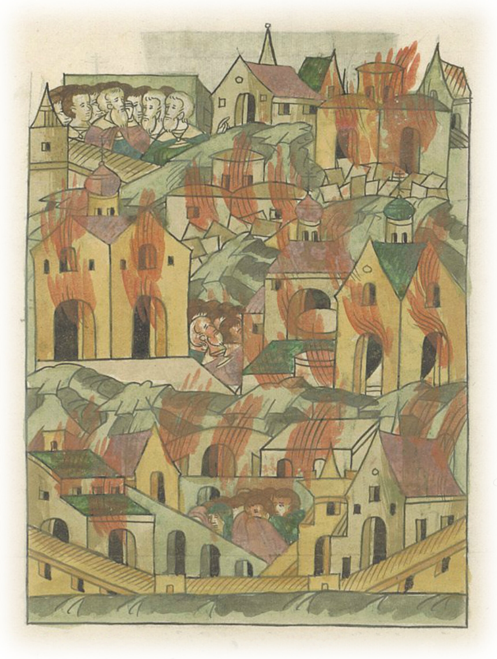 В том же месяце горело в Новгороде Великом: загорелось у церкви Николы на Буевище, несколько дворов сгорело, и церкви каменные выгорели с живыми людьми, а иные и завалились, и люди горели; и не помнят при себе такого пожара.