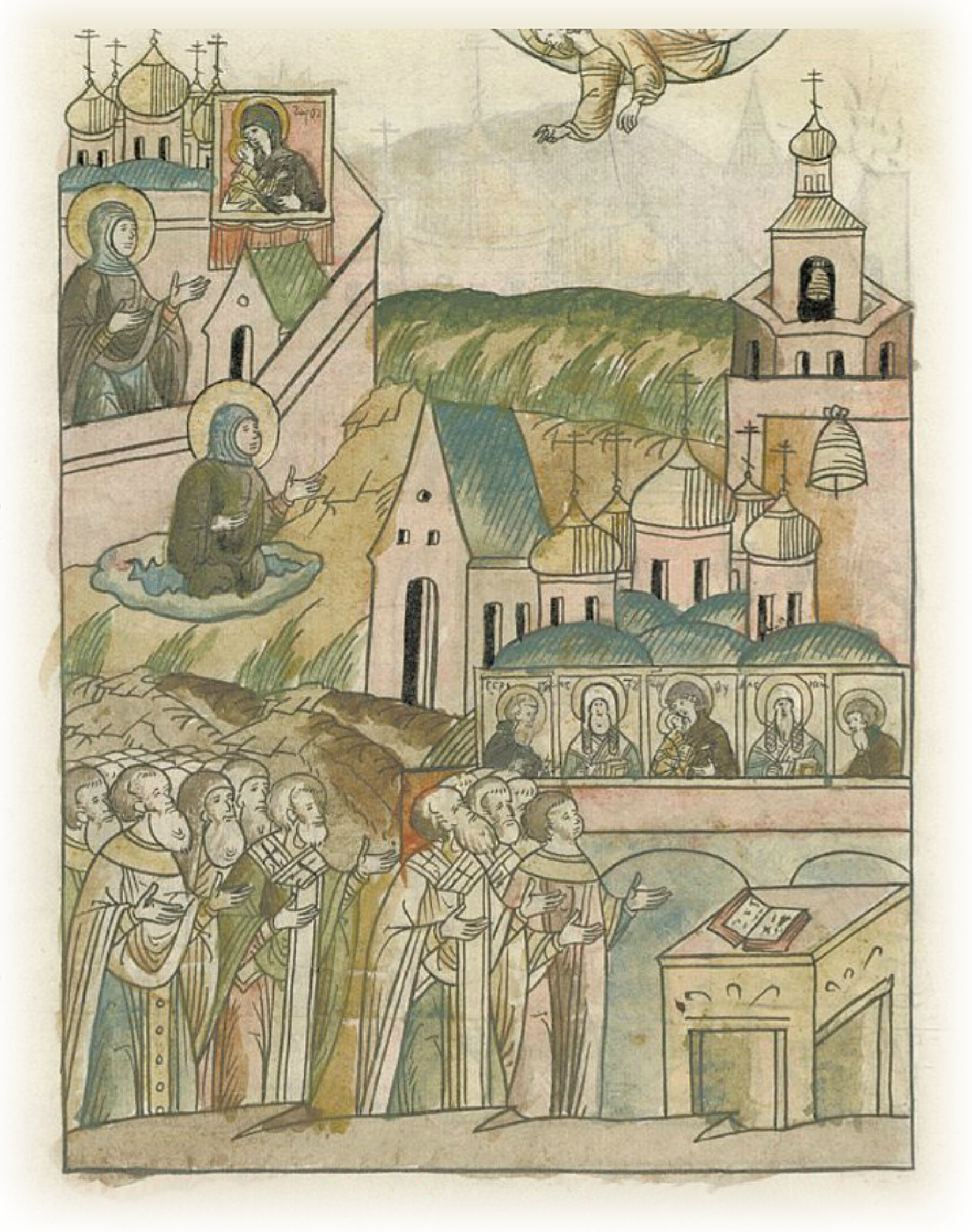 Видение необычное и милостивое слепой инокине. И так тогда премилостивый Христос Бог наш, к которому обращались, показал преславное чудо, уму человеческому непостижимое, (молитвами) Пречистой Своей матери и святых великих святителей, преподобных отцов и чудотворцев русских, которое захотел показать Бог.