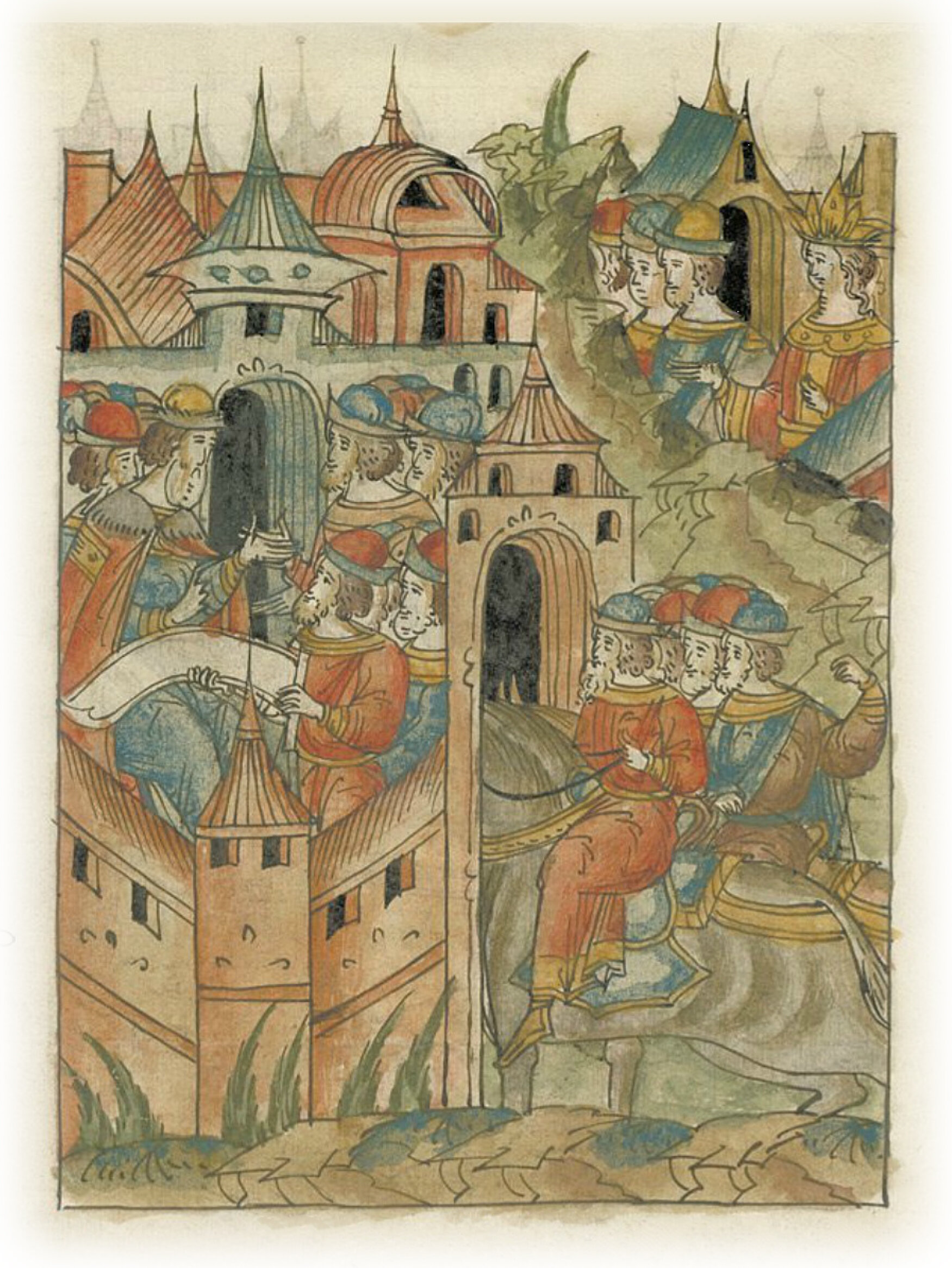Ругодивские посадники Яким и Захар приезжают в Москву. Воеводы царя Ивана Васильевича Алексей Адашев и Иван Михайлов сообщают им, что государь пожалует их, если сдадут его воеводам помимо Ругодива Вышгород.