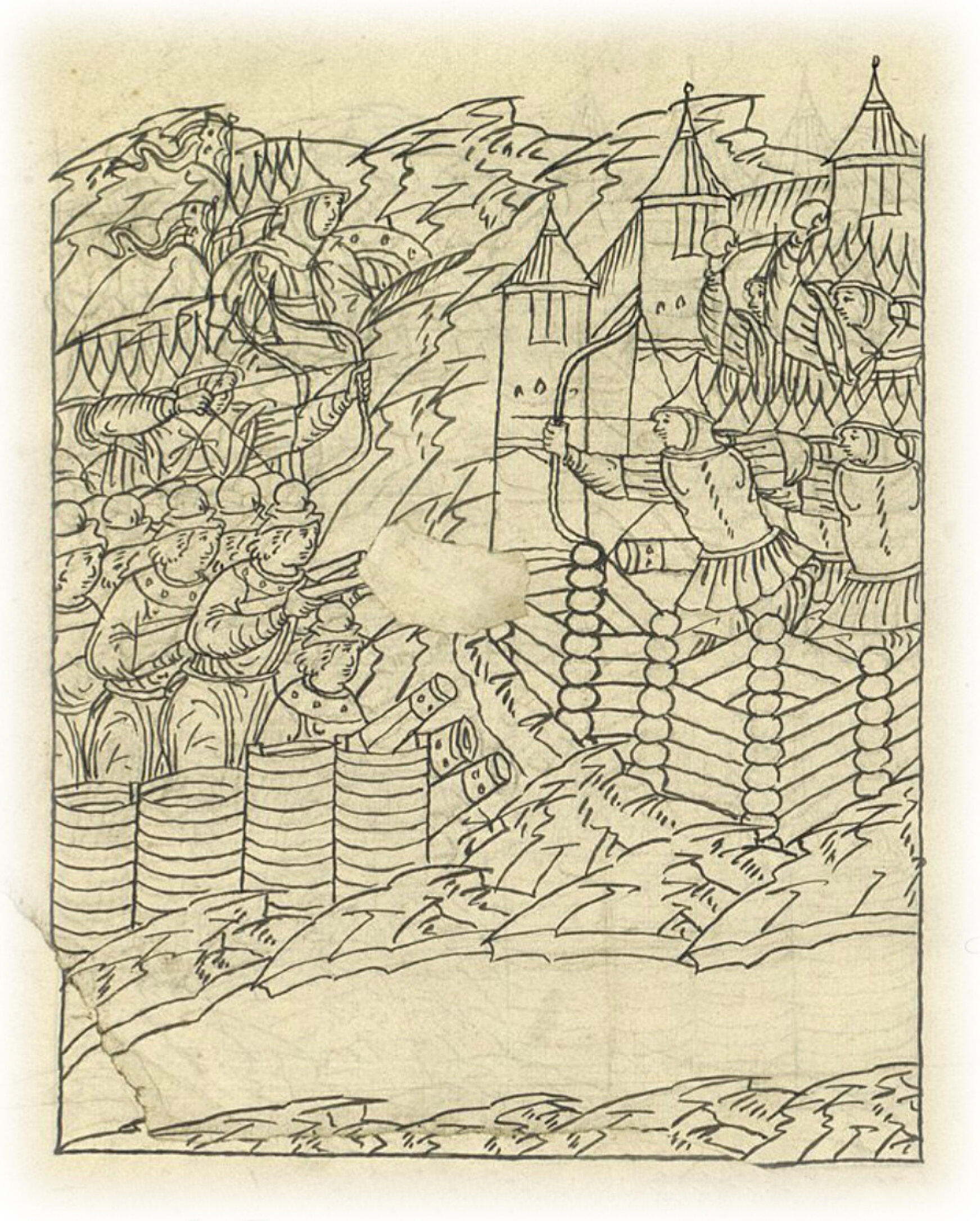 Татары, видя, что воины царя Ивана Васильевича встают на рвах, стреляют из пушек, пищалей и луков, метают камни.