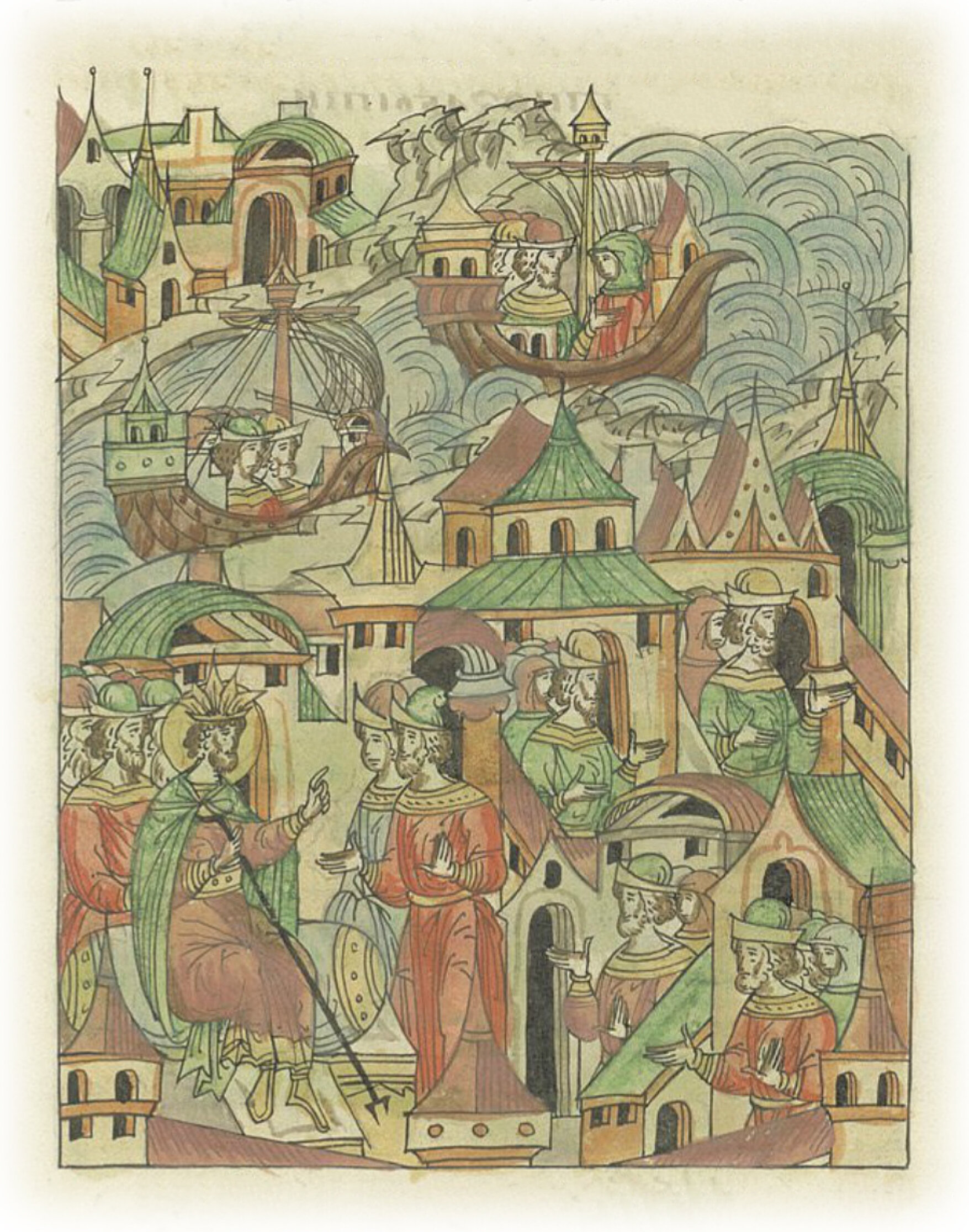 Повесть о Царьграде. Увидев, что в его городе живет мало людей, царь Константин собирает из Рима и разных стран вельмож, мегистанов и сановников, и со множеством людей приводит их в свой город, строит большие дома и чтит чинами, чтобы они забыли свое отеч