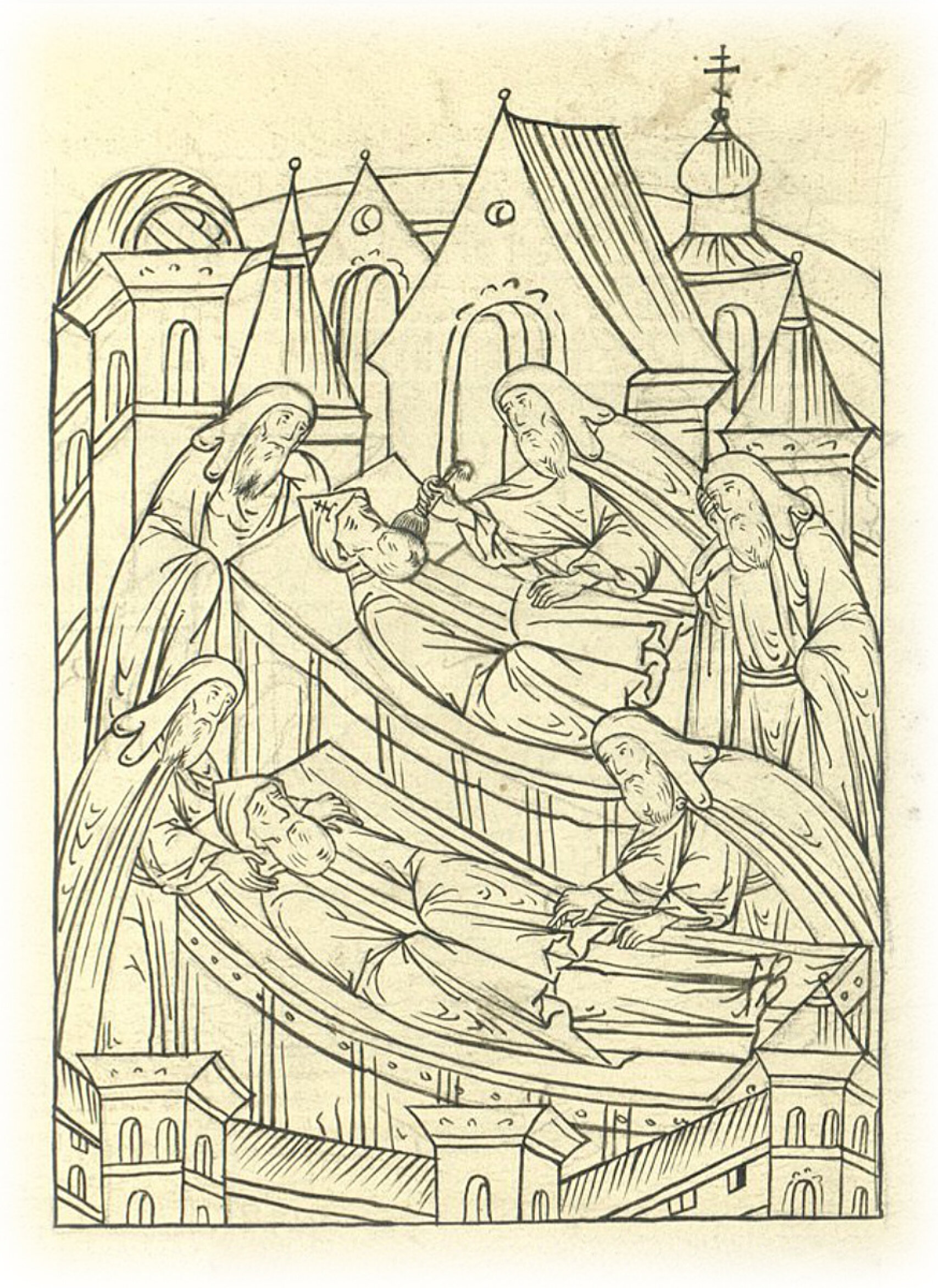А у великого князя остался игумен Троицкий Иоасаф да старец Мисаил Сукин; и начали его наряжать и бороду его чесать, как подобает в чернеческом чине быть, и положили под него одр из Чудова монастыря, и положили тело его на одре.