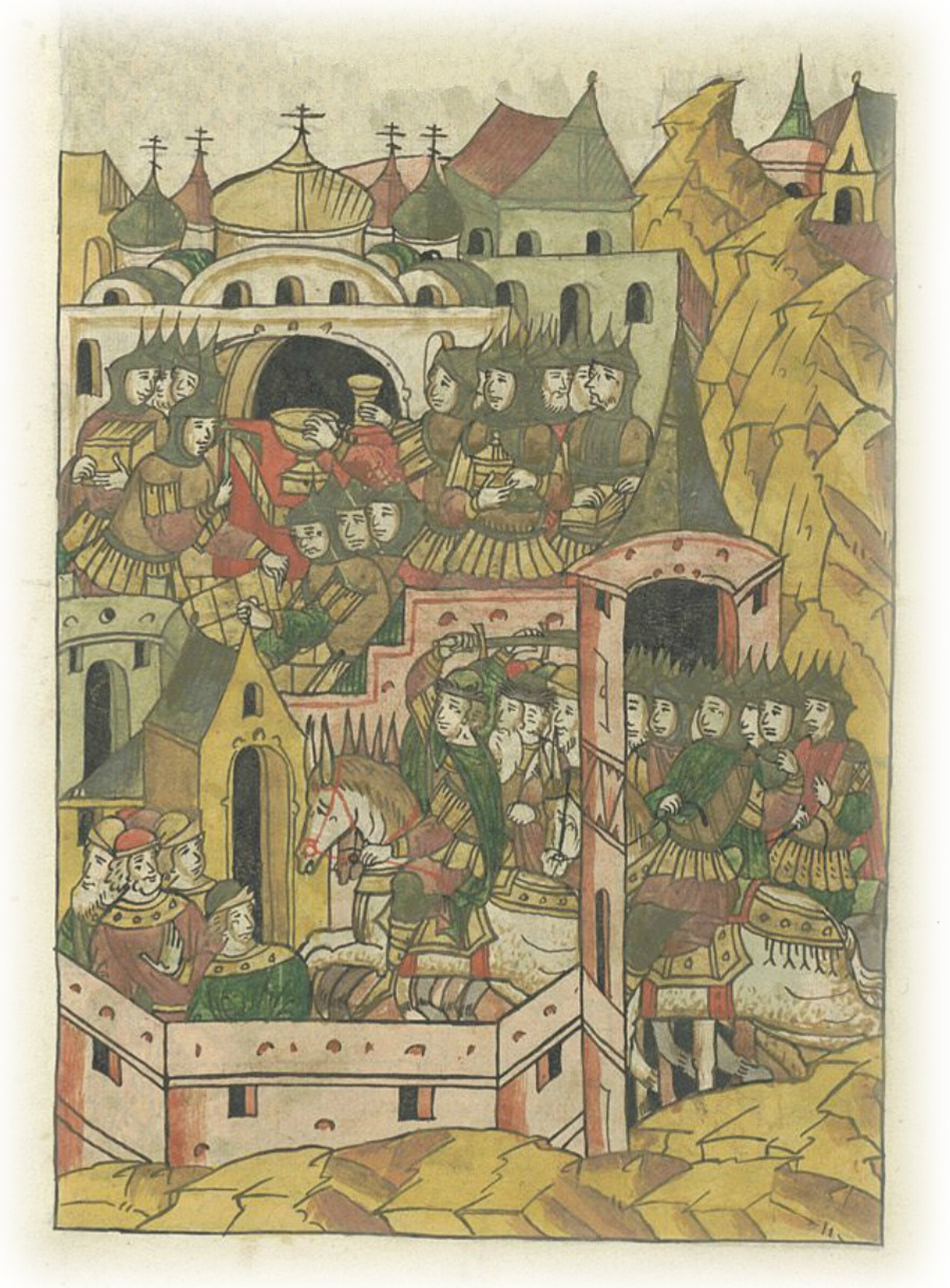 Рать же татарская с князем Андреем Александровичем Городецким и с князем Федором Ростиславичем Ярославским придя, взяла Владимир, и церковь владимирскую разграбила, и чудное дно медное выдрали, и сосуды священные все забрали.