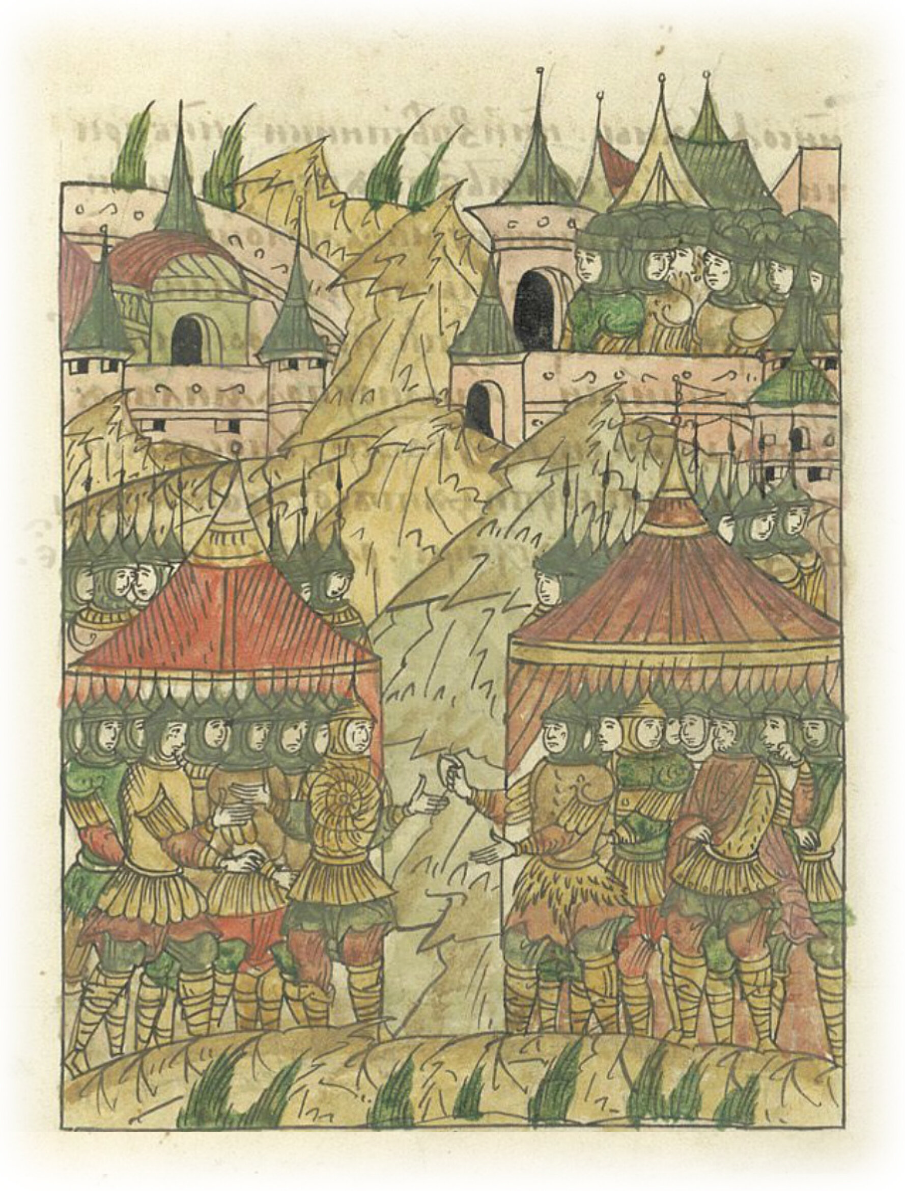 И новгородцы решили долго стоять под городом, а псковичи не захотели долго стоять. Новгородцы говорили им: «Между нами было решено, что наш посадник не будет ни сидеть у вас в Пскове, ни судить, а судить ваших псковичей владыка будет, а из Новгорода вас не брать и не приглашать ни дворянами новгородскими, ни стражниками новгородскими, ни софиянами*, ни изветниками**, ни биричами***. (Ведь мы договорились, что) нам псковичи братья, а Псков Новгороду младший брат. Но вы быстро забыли любовь и милость и не хотите немного потерпеть, чтобы устрашить врагов. И если так упрямитесь, то уходите восвояси ночью, чтобы не увидели враги и не порадовались, говоря: «А у них раздор». * священнослужители и челядь, состоящая при храме св. Софии новгородской; ** лица для поручений в суде; *** должностное лицо, объявляющее указы и распоряжения.