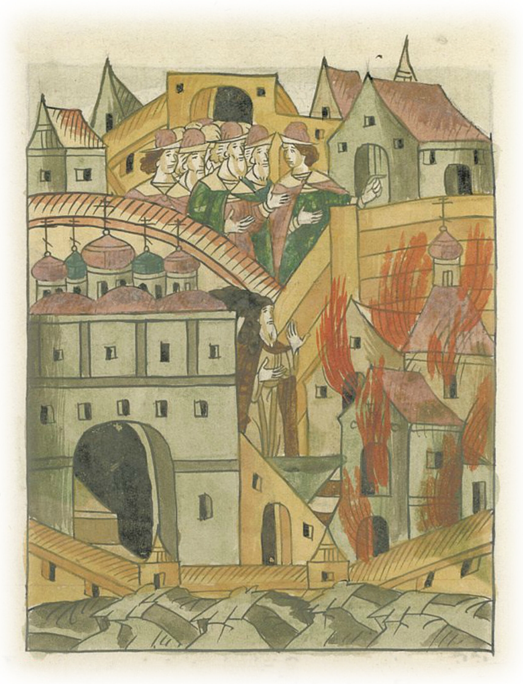 Пожар в Чудовом монастыре, в котором сгорают трапезная и келья архимандрита Геннадия.