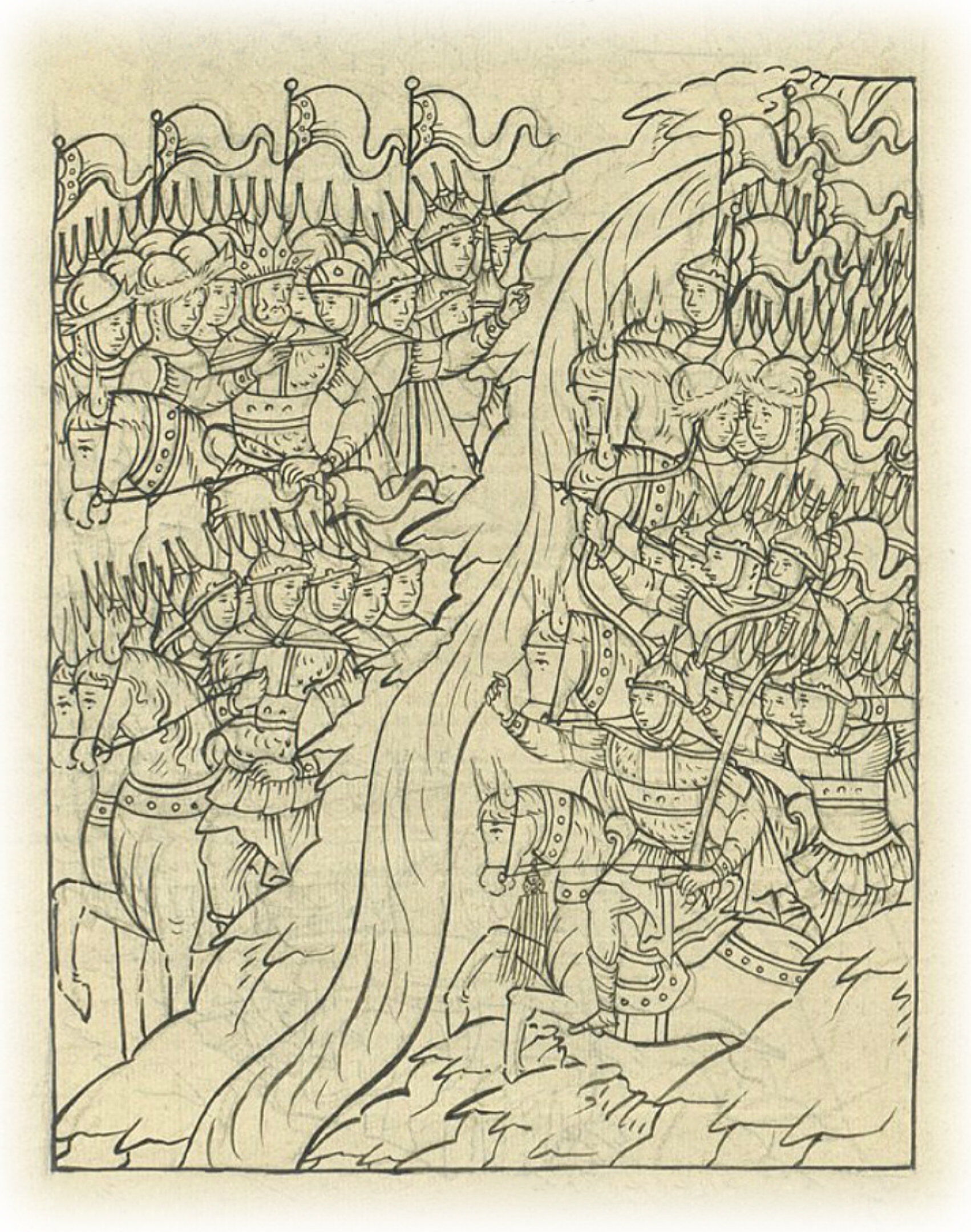 И начали поносить татар, и берег просить. Царь же видел полки и подивился храбрости русских сынов; и пришел на него ужас, и пал страх в сердце его, и хотел бежать в тот же час, но князья удержали его.