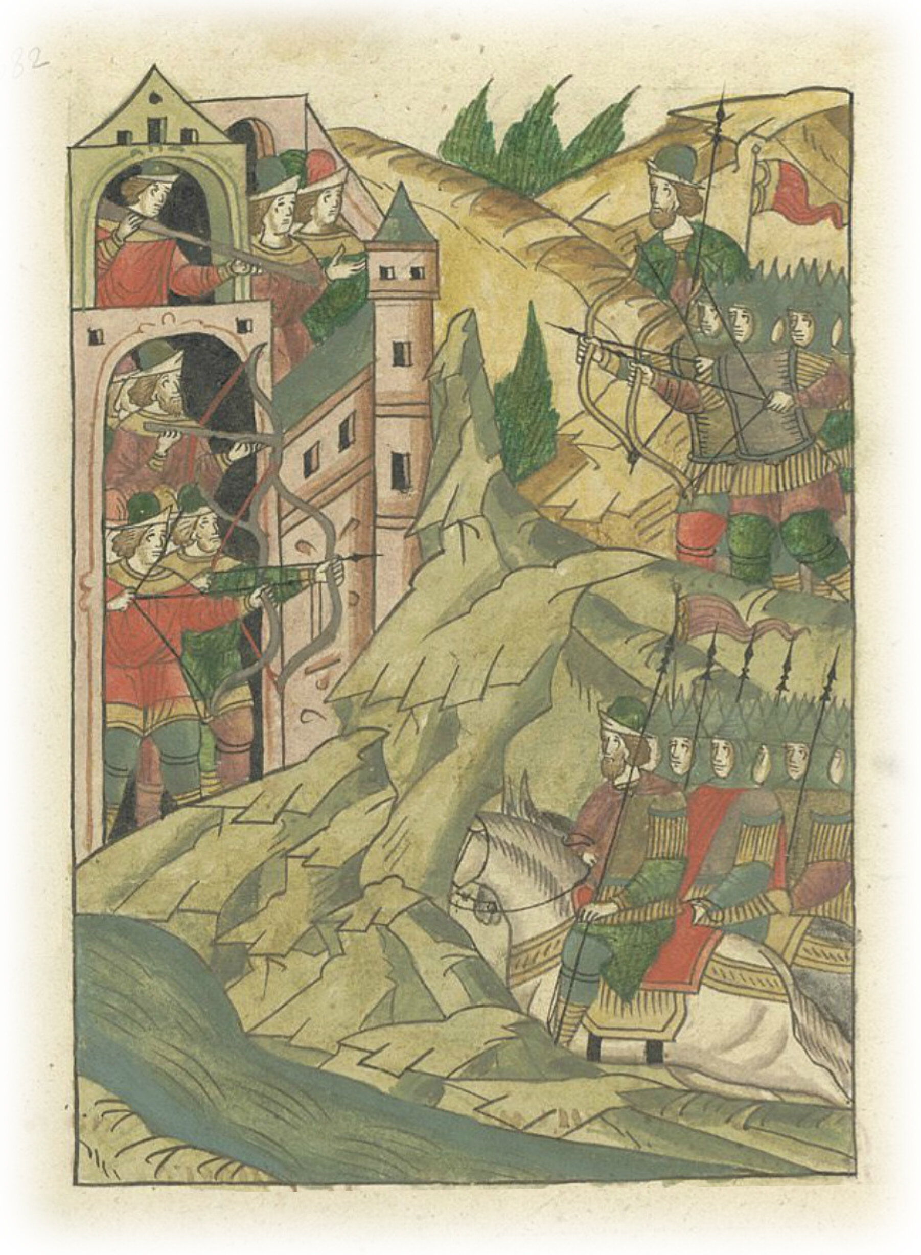 Казанцы же вышли из города им навстречу, стреляя из луков и самострелов, некоторые же стреляли из пушек, стремясь испугать русское войско,