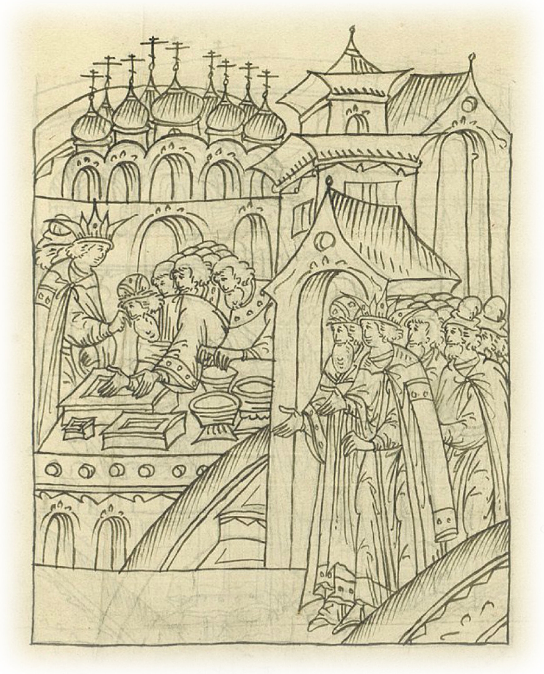Царю же благочестивому в сладость было принять святительский совет и поучение, и пришли царь и святитель вместе в церковь Благовещения Пресвятой Богородицы, которая находилась недалеко от царской казны, и вынимают мощи святых отцов из сосудов и кладут на блюдо, и принимает это блюдо митрополит и весь освященный собор,