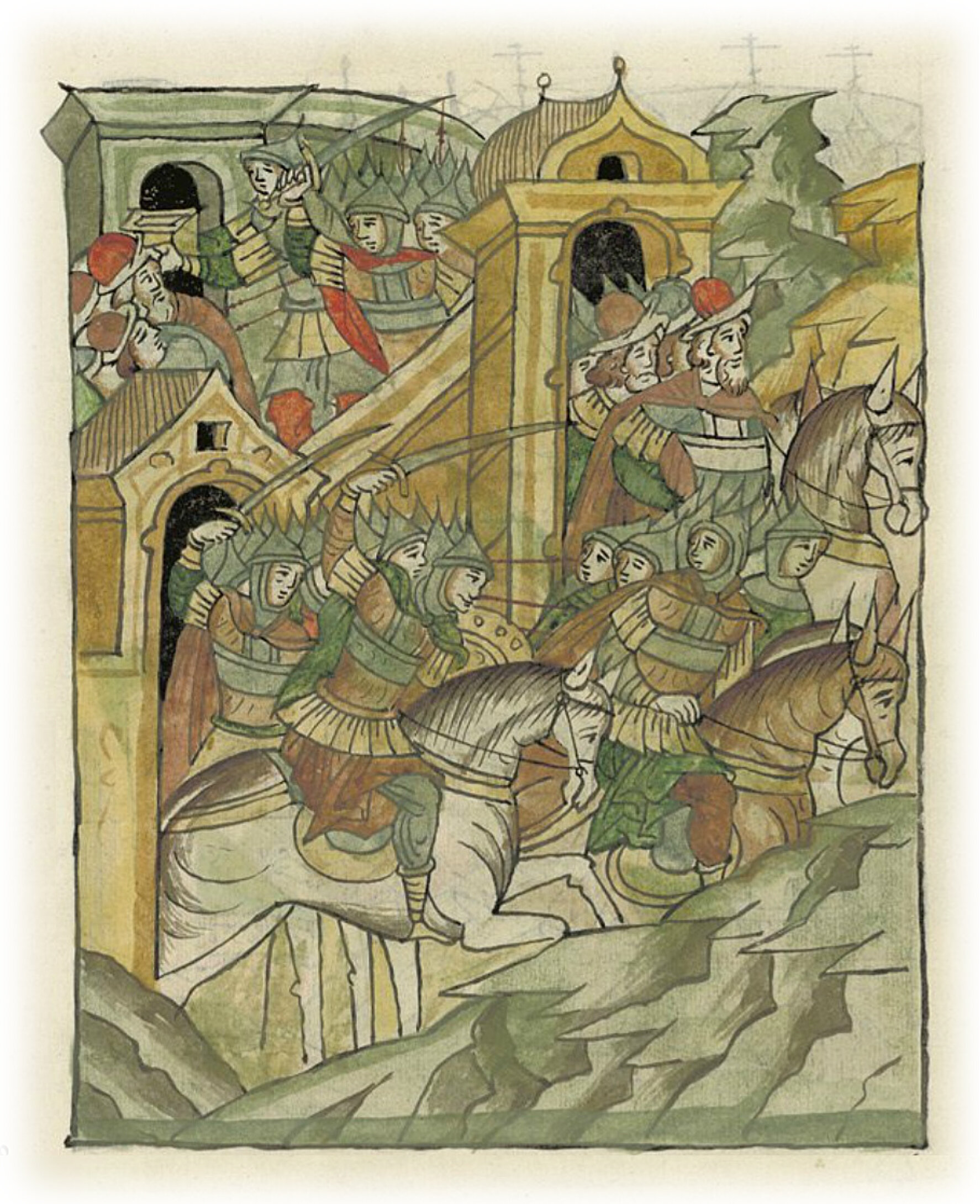 Языки говорят воеводам царя Ивана Васильевича, что магистр окопался большим рвом вокруг города Рындола, бьет из пушек и пищалей и приступает к Рындолу.