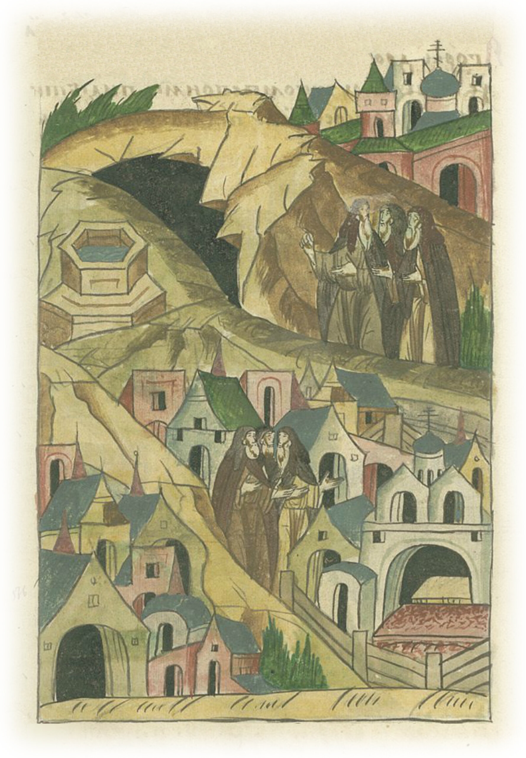 а на юг, близко от города Иерусалима – Силоамская купель, где Господь слепого послал умыться. А оттуда близко от той – пещера великого Антония пустынника. А оттуда близко – село Скудельничное, что иудеи купили ценою Христовою. А далее на юг от Иерусалима за пятьдесят поприщ – Саввин монастырь и гроб великого Саввы. Там было 14 тысяч чернецов, кельи их и ныне можно распознать.