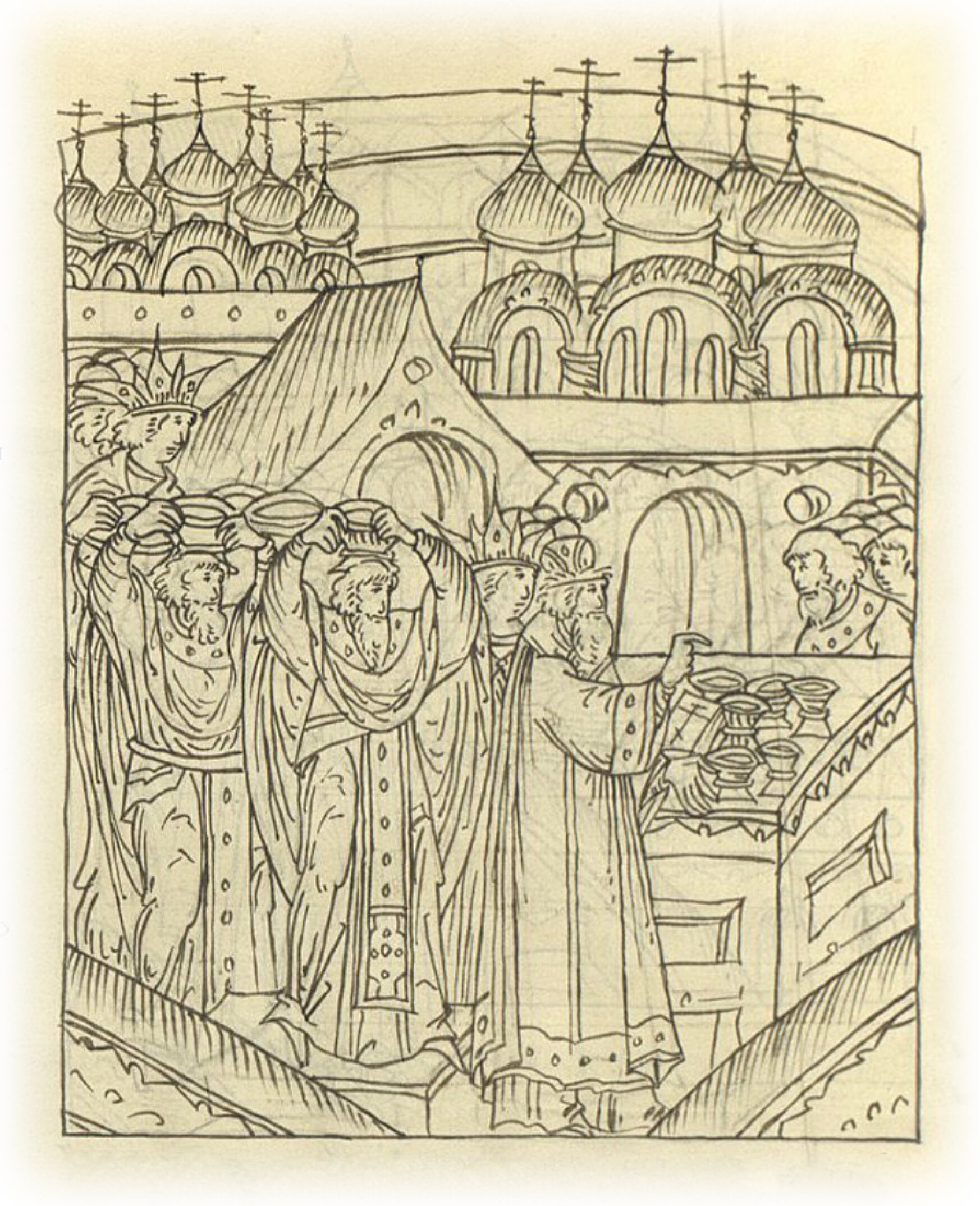 Царь Иван Васильевич с митрополитом Макарием несут мощи святых отцов в соборную церковь Успения Пречистой Богоматери, совершают молебные службы и освящают воду со всех мощей.
