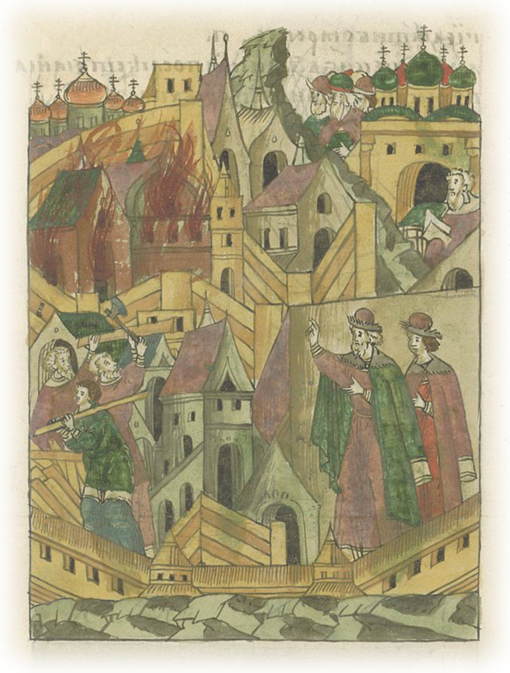 Месяца марта в 20 день, в среду на пятой неделе Поста, после службы, в 7 часов ночи, загорелся двор князя Андрея Меньшого, и сгорели дворы обоих князей Андреев; а дворцы малые около их дворов, (владения) попов архангельских, те разметали, ибо отстаивал сам князь великий и сын его, и многие дети боярские, потому что не успел лечь еще князь великий после стояния в церкви на Великом каноне Андрея (Критского).