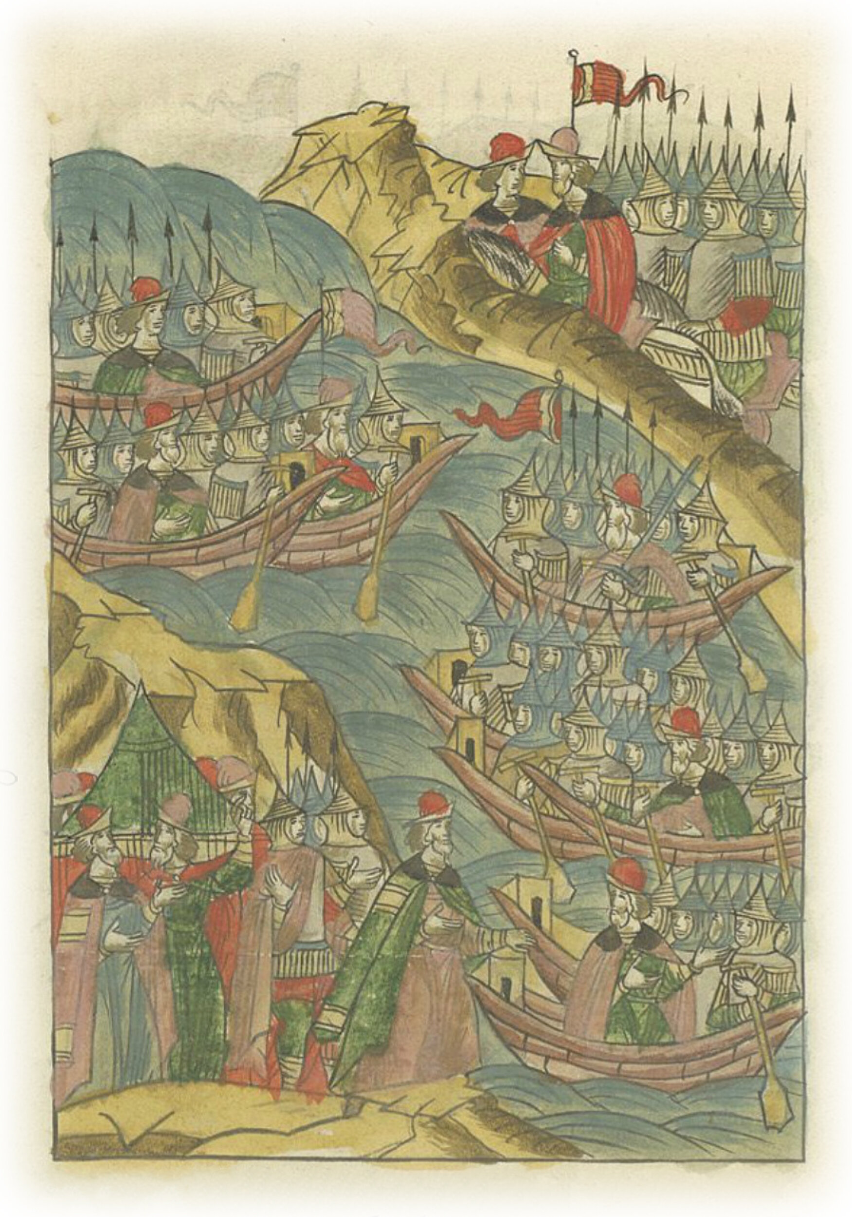 Увидев это, воеводы великого князя и все воины его бросились в суда свои, и погребли навстречу судовой рати татарской,