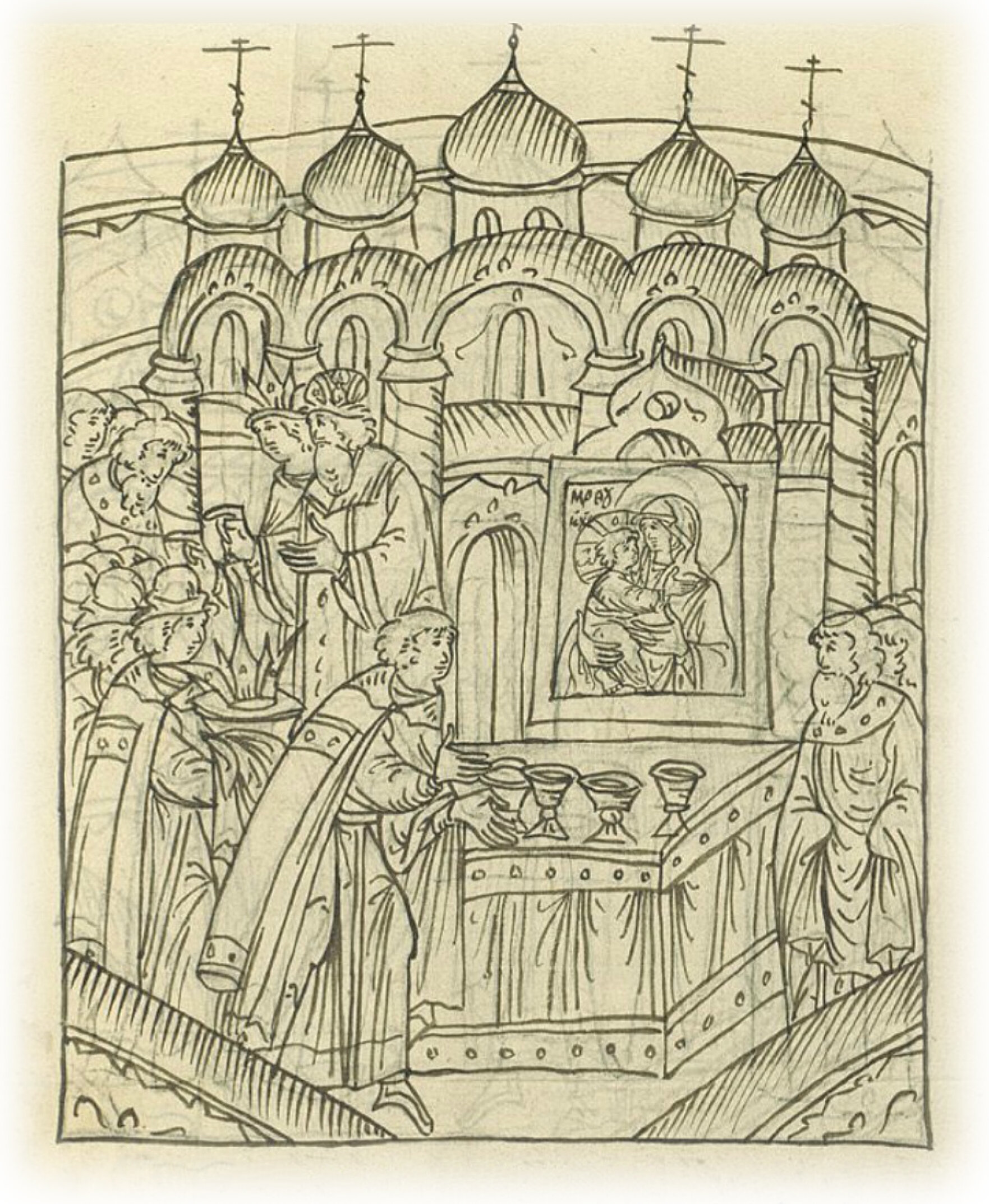 Царь же благочестивый приходит к чудотворному образу Пречистой (Богородицы) и к чудотворным и цельбоносным мощам святых отцов и со слезами долгое время творил моление, только Единый Бог об этом знает, и, совершив моление, выбирают царь и святитель мужа изрядного и наученного боговдохновенному писанию Архангельского протопопа Тимофея,