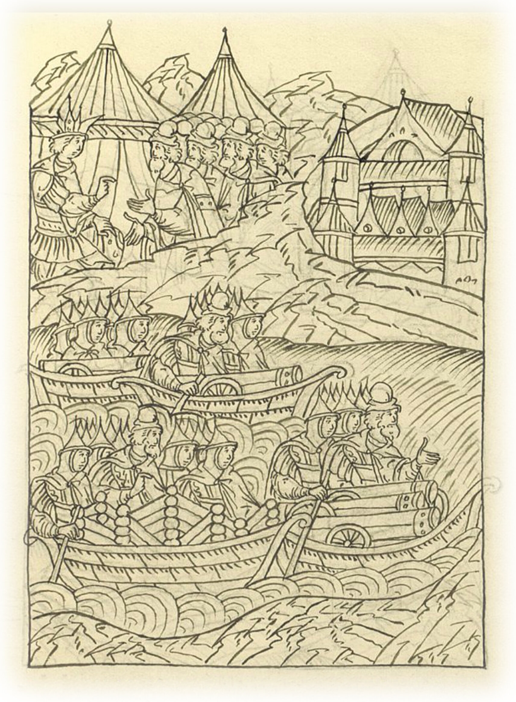 Царь Иван Васильевич отпускает в судах боярина Михаила Яковлевича и дьяка Ивана Выродкова, повелев привезти башни и терасы.