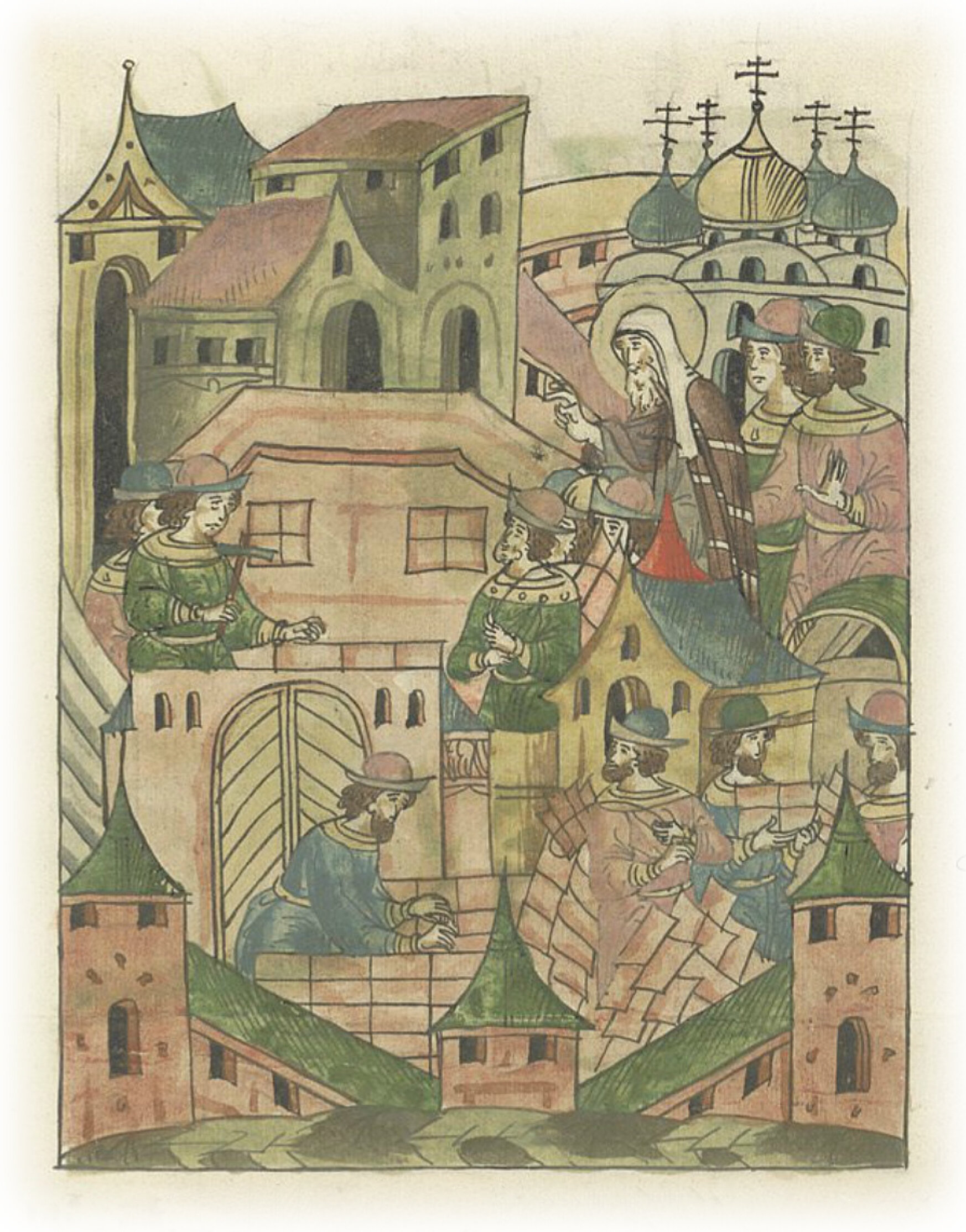 Новгородский владыка Евфимий закладывает каменную церковь святого чудотворца Петра, митрополита всея Руси, у себя во дворе на воротах, а старую церковь разрушает.