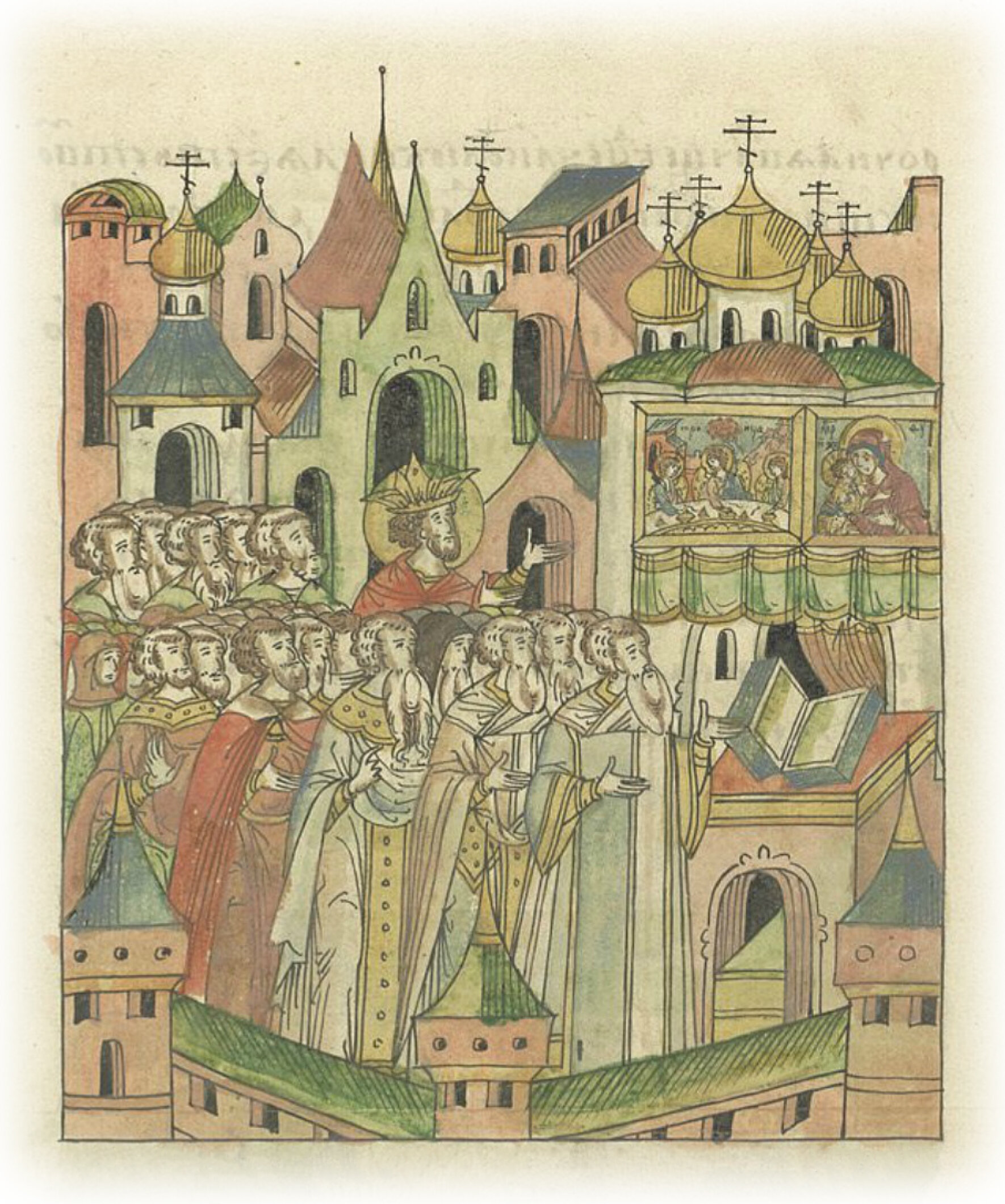 Повесть о Царьграде. Царь Константин собирает весь священнический чин, царский синклит и множество народа, и, сотворив литию и молебны, они передают город в руки святой владычице Богородице Одигитрии, то есть наставнице.