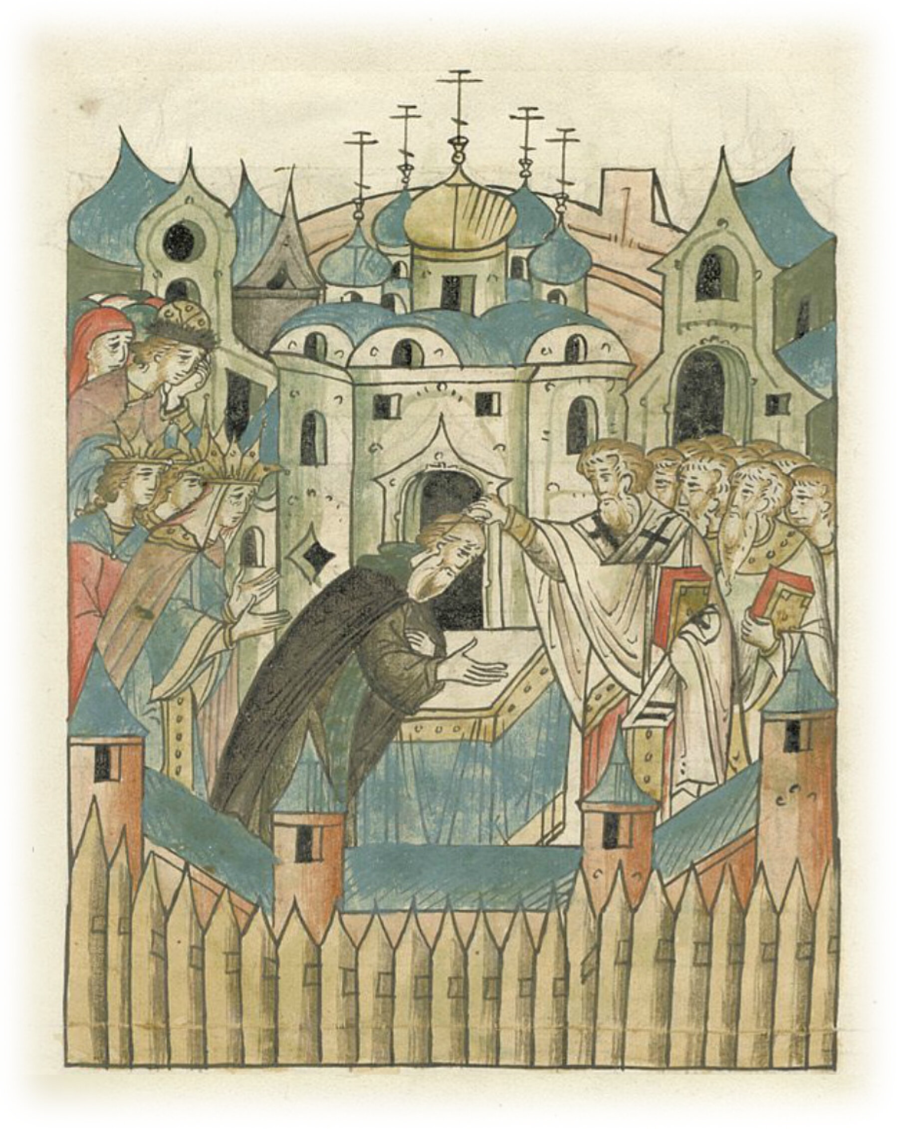 И вошли все в церковь пречистой Богородицы соборную, и постриглись в святой и ангельский чин и иноческий образ от владыки Митрофана - и великая княгиня, и сыновья ее, и дочери, и снохи ее, и все, кто хотел; и был крик и вопль, и плач великий в городе.