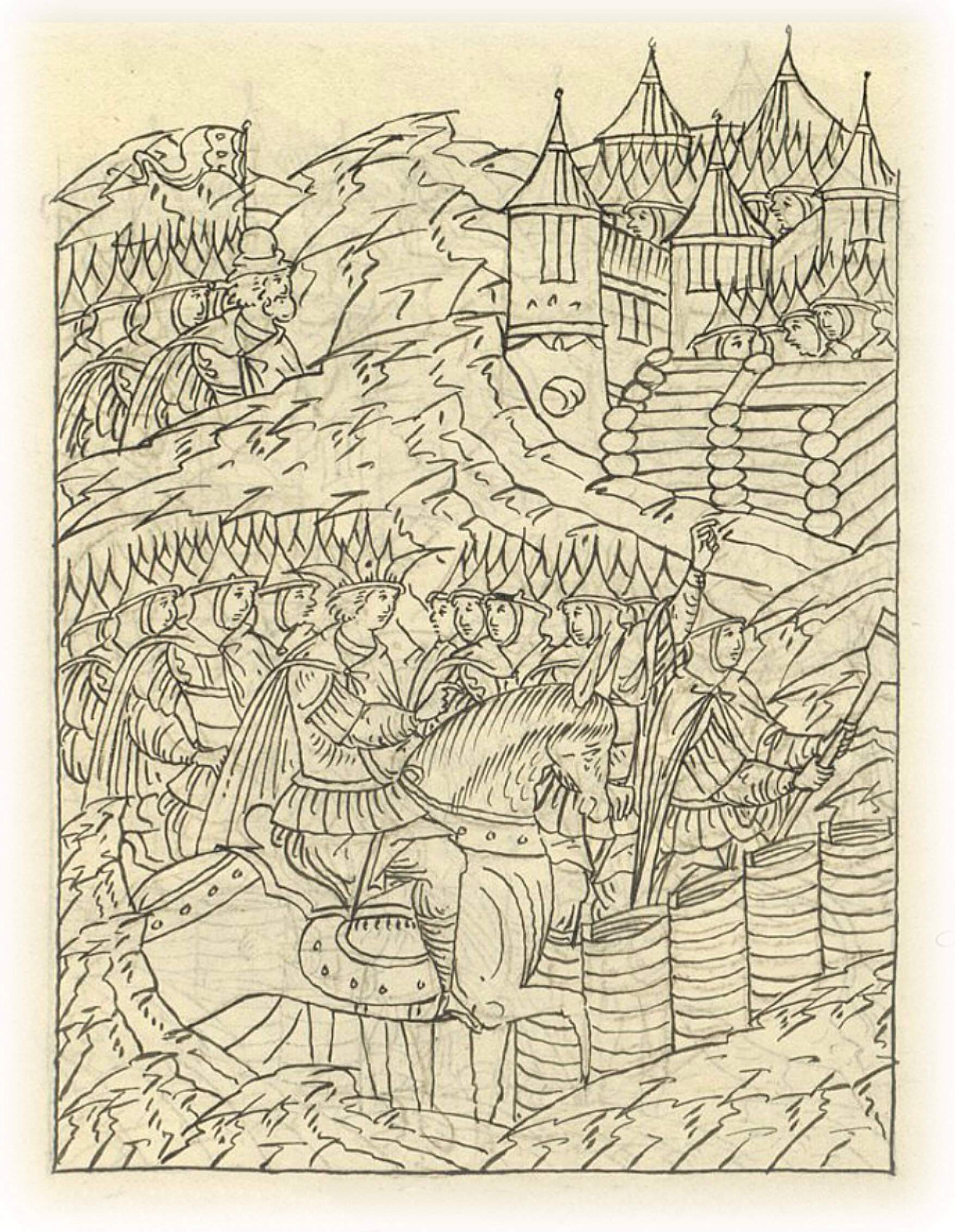 Языки говорят воеводам царя Ивана Васильевича, что магистр окопался большим рвом вокруг города Рындола, бьет из пушек и пищалей и приступает к Рындолу.
