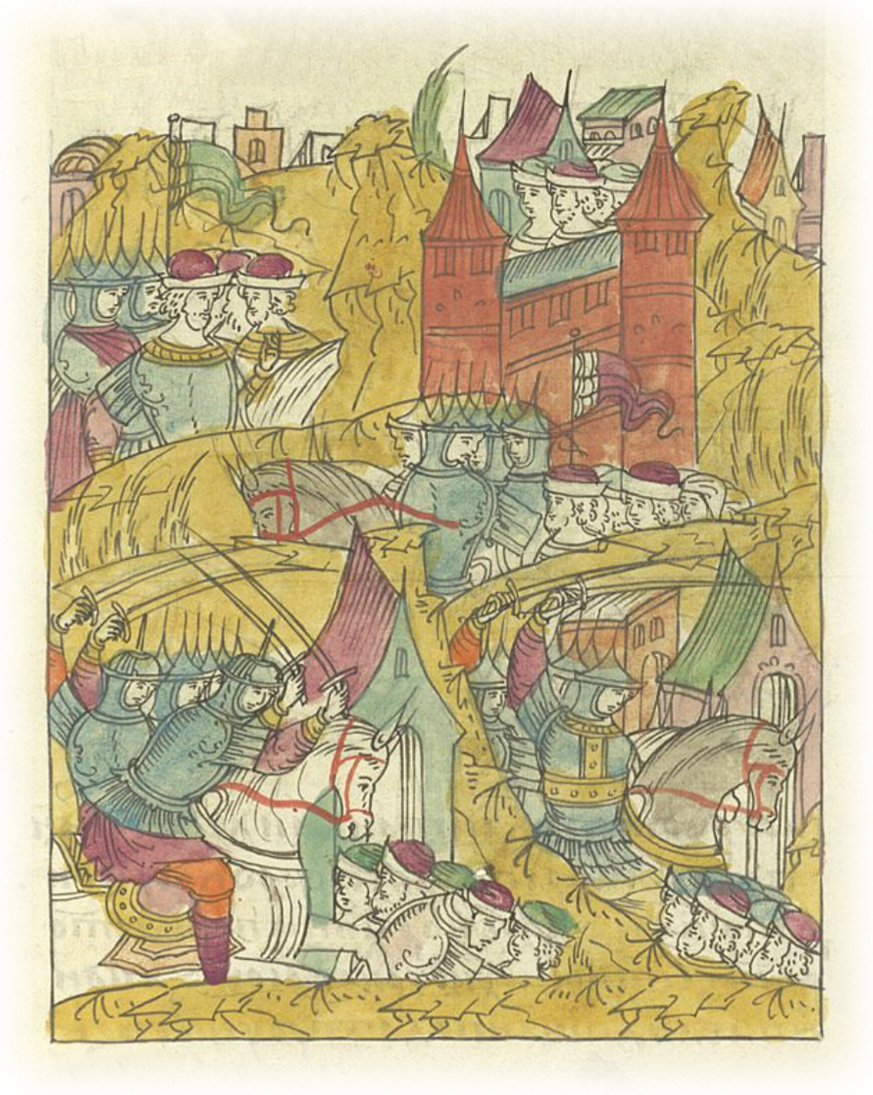 Языки говорят воеводам царя Ивана Васильевича, что магистр окопался большим рвом вокруг города Рындола, бьет из пушек и пищалей и приступает к Рындолу.