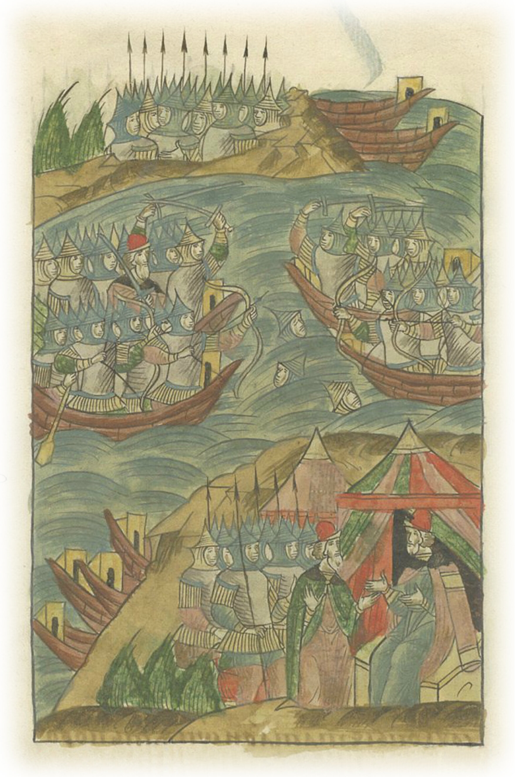 Они же, повернувшись, прогнали татар к своим. И так бились весь тот день до самой ночи, и разошлись ночевать каждые на свой берег.