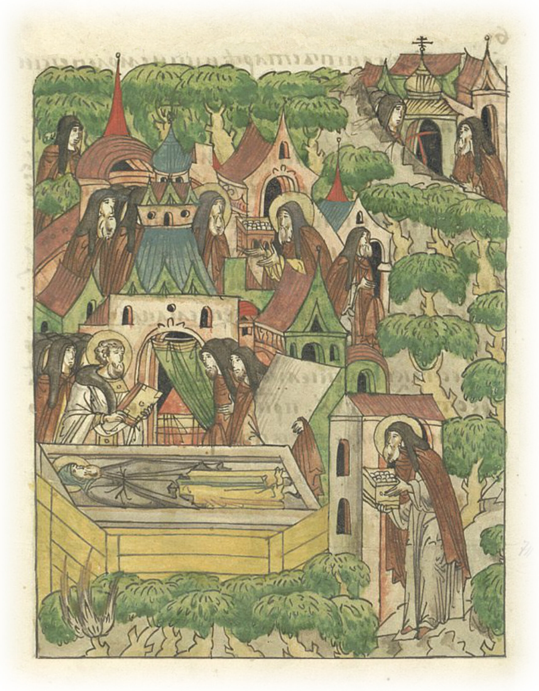 В начале иноков было всего числом 12, и так было два или три года. И если один из них убывал, или отходил из монастыря, или Господь забирал, тогда на его место принимали другого, и число монахов не менялось. Через некоторое время пришел к святому прежде упомянутый Симон. Расскажу немного о нем. Симон был старейшим Смоленским архимандритом, славным, известным и честным, особенно отличался добродетелью своей. И он оставляет архимандритство, честь, славу, отечество, ближних и друзей и решает отправиться странником от Смоленска до Москвы и до Радонежа. Пришел в монастырь к преподобному Сергию с большим имением и богатством и передал ему все это на устроение монастыря. И жил он много лет в смирении добродетельной жизнью, в жестоком послушании. И, дожив до старости, преставился, отойдя к Господу. Преподобный похоронил его как подобает. И потому осталась вечная память о нем.