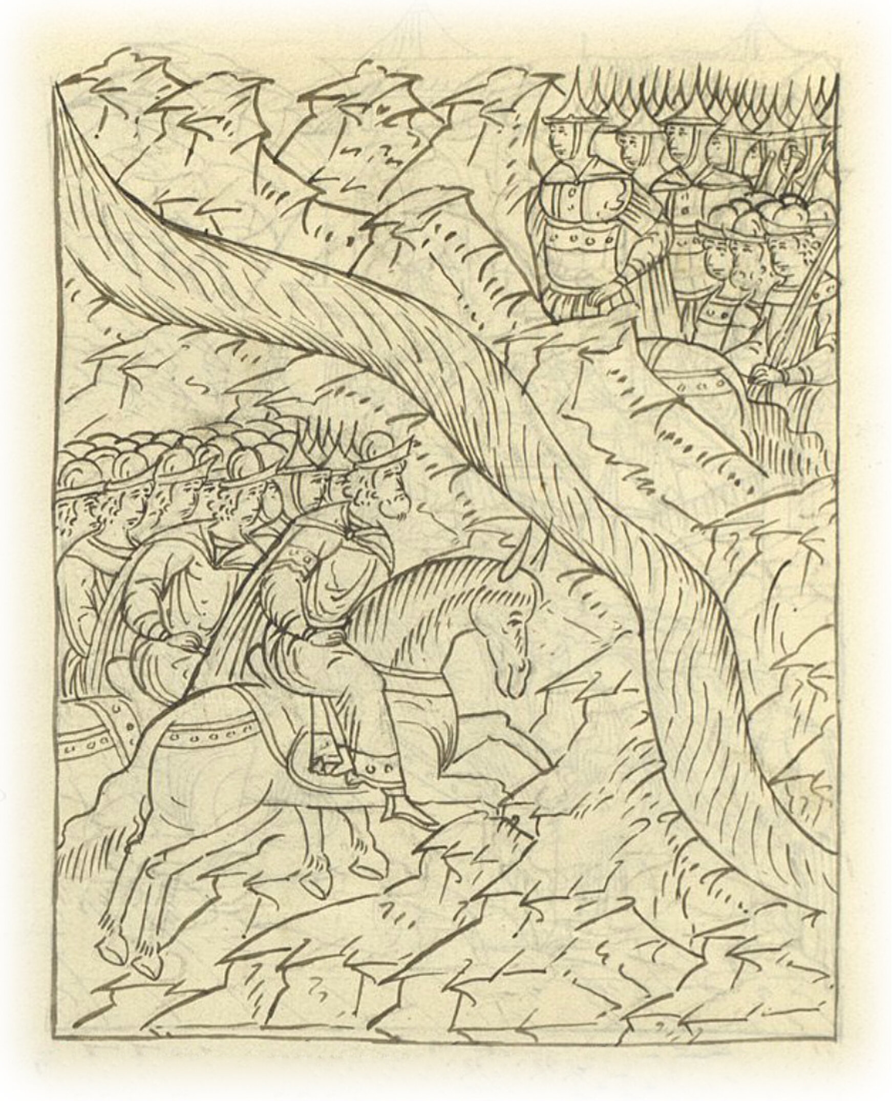 Воеводы царя Ивана Васильевича, разделившись, идут в погоню за царем Емгурчеем.