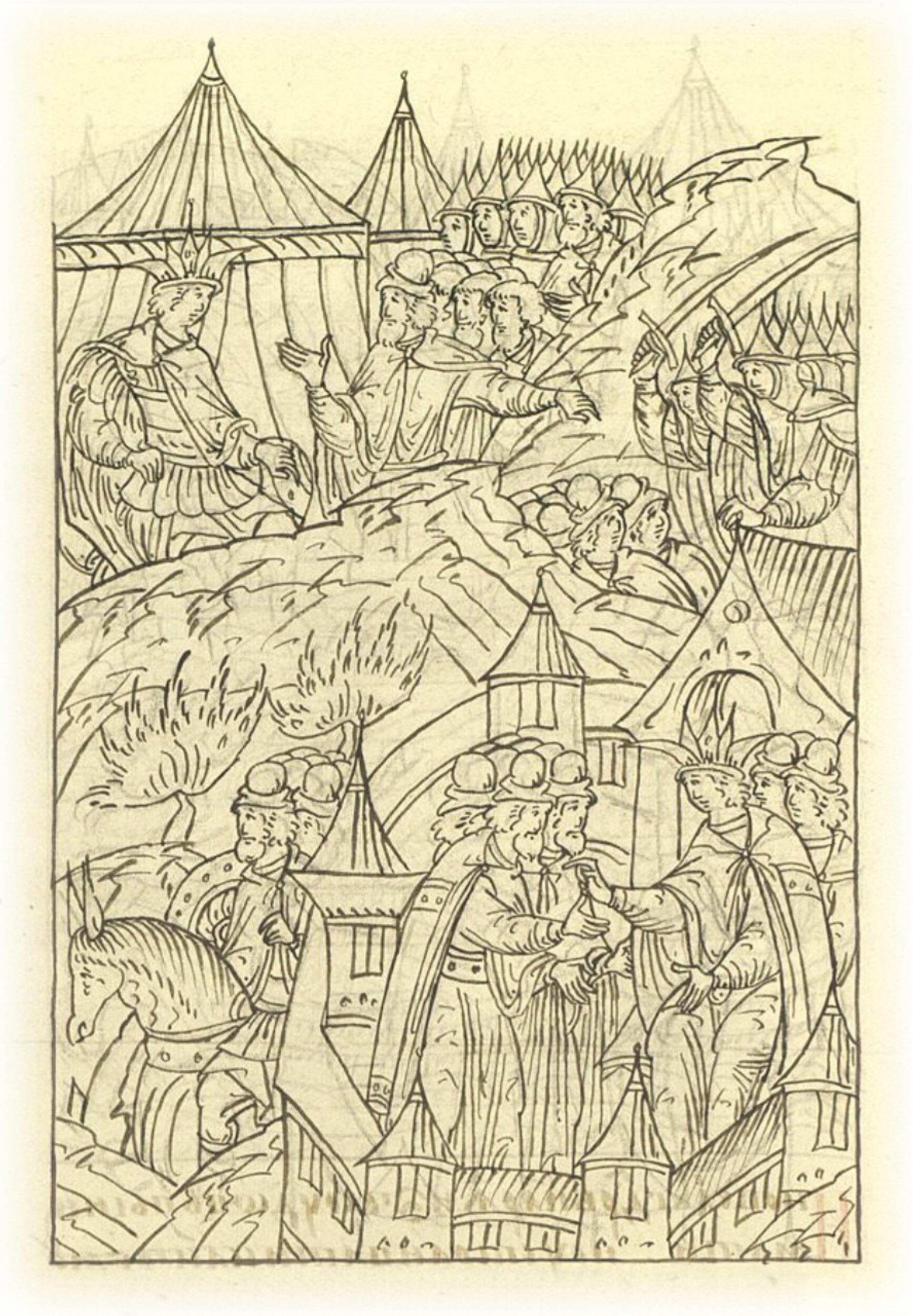 Ругодивские посадники Яким и Захар приезжают в Москву. Воеводы царя Ивана Васильевича Алексей Адашев и Иван Михайлов сообщают им, что государь пожалует их, если сдадут его воеводам помимо Ругодива Вышгород.