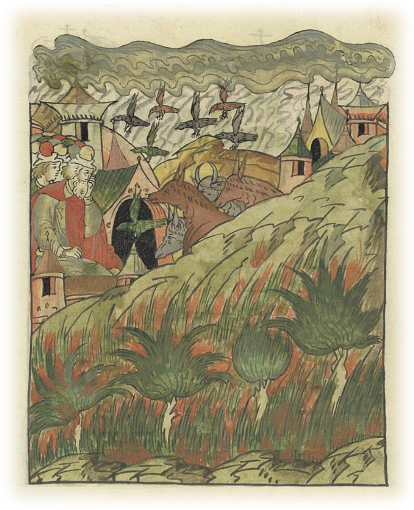 В 6731 (1223) году была засуха великая. Погорели многие леса, и боры, и болота. И дым был тогда такой сильный, что люди ничего не видели, ибо мгла лежала на земле, и птицы по воздуху летая, ничего не видя, падали на землю и погибали, и звери всякие в города и в села к людям заходили. И был страх и ужас у всех.