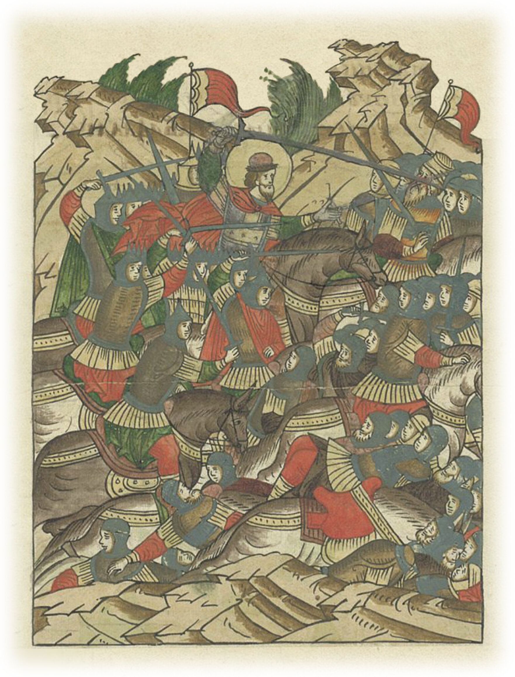 И после этого Александр поспешил начать бой в шестом часу дня. Была сеча великая с римлянами, и избил он бесчисленное множество римлян, и самому королю оставил печать на лице его острым своим мечом. Тогда же явились в полк великого князя Александра Ярославича 6 мужей храбрых, которые бились крепко вместе с ним.